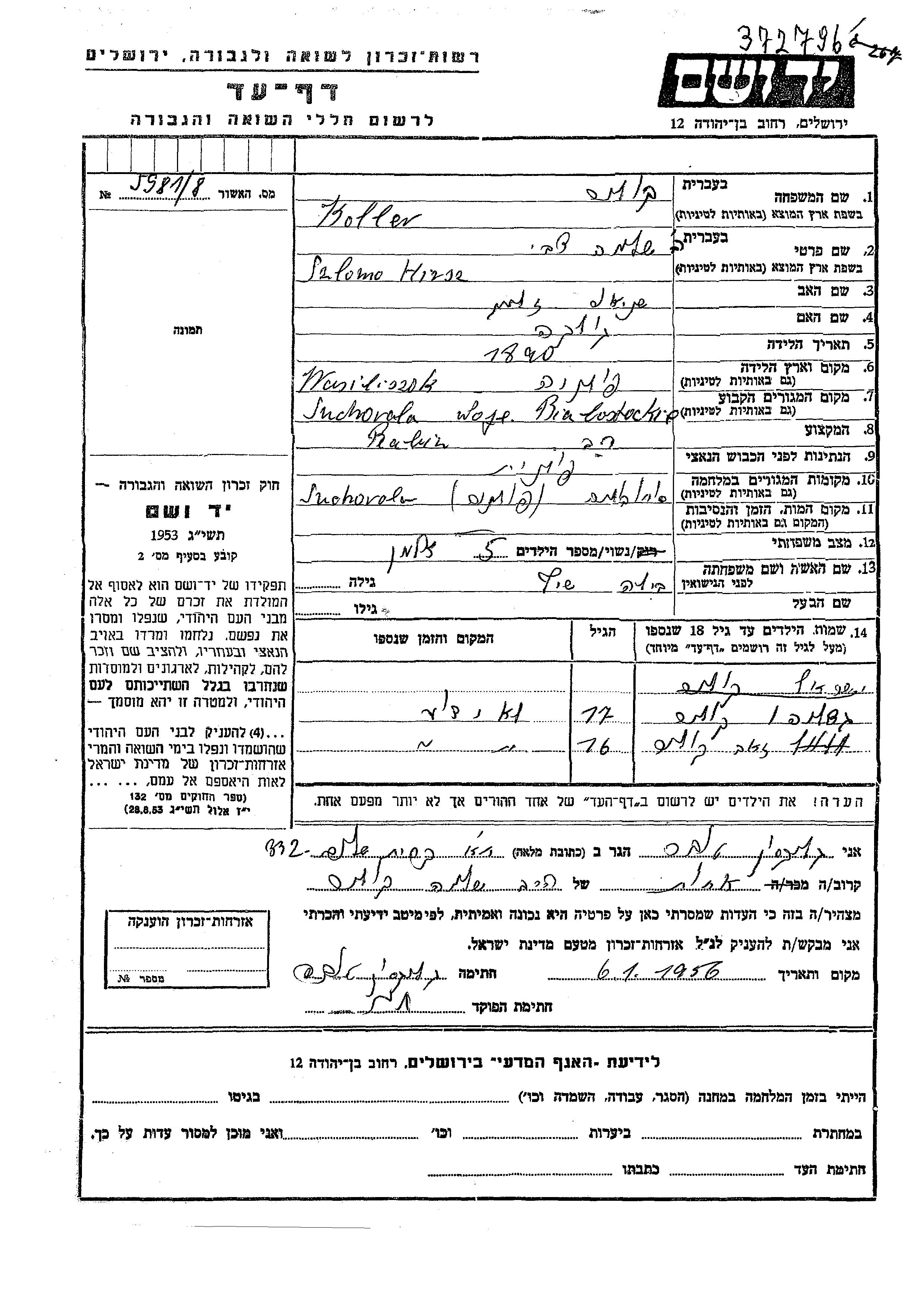 Koller Kolner Szlomo Hirsz Tzvi 1890 Suchowola, Pologne Feuille de témoignage