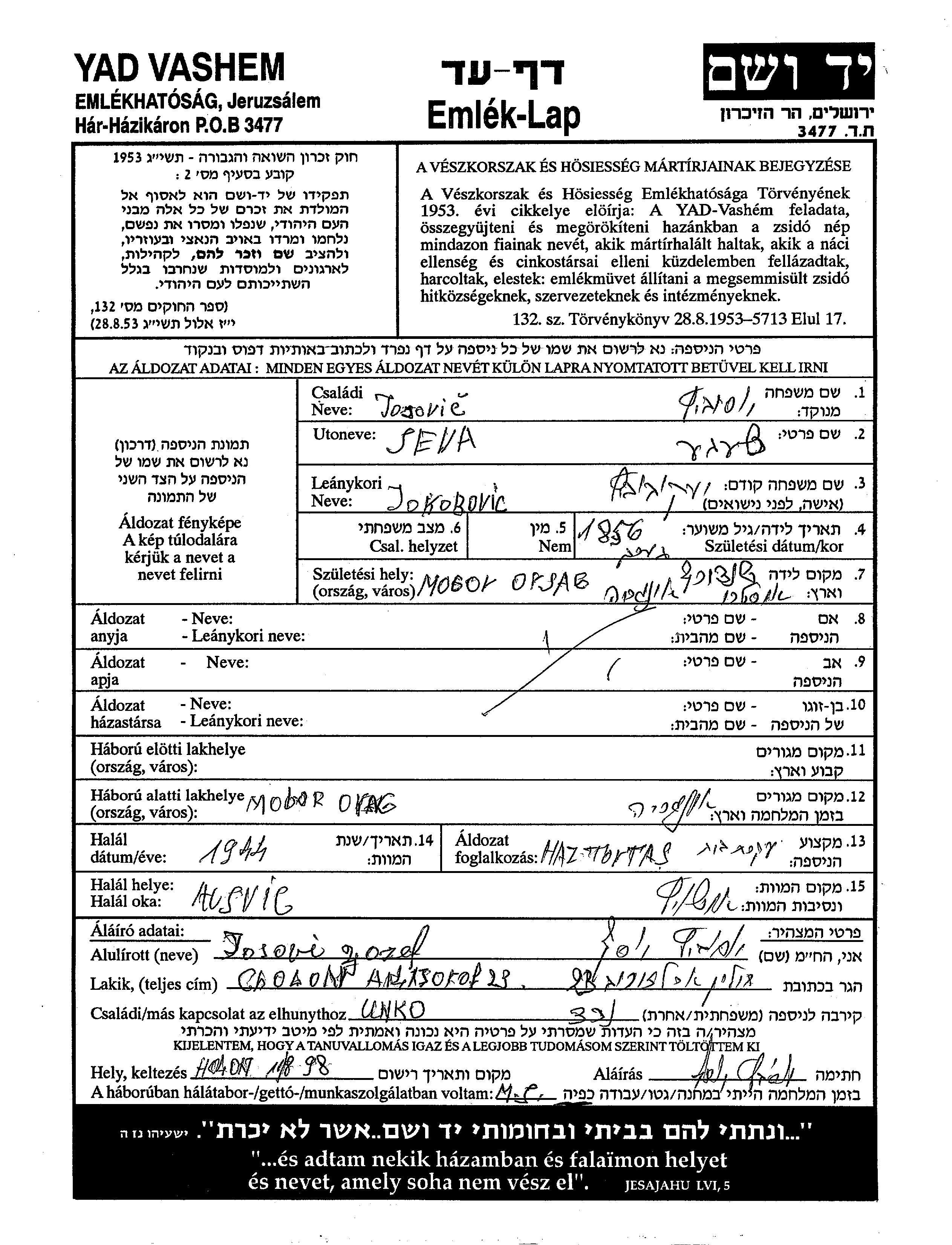 Josovic Seva Sheva 1856 endroit inconnu, Feuille de témoignage
