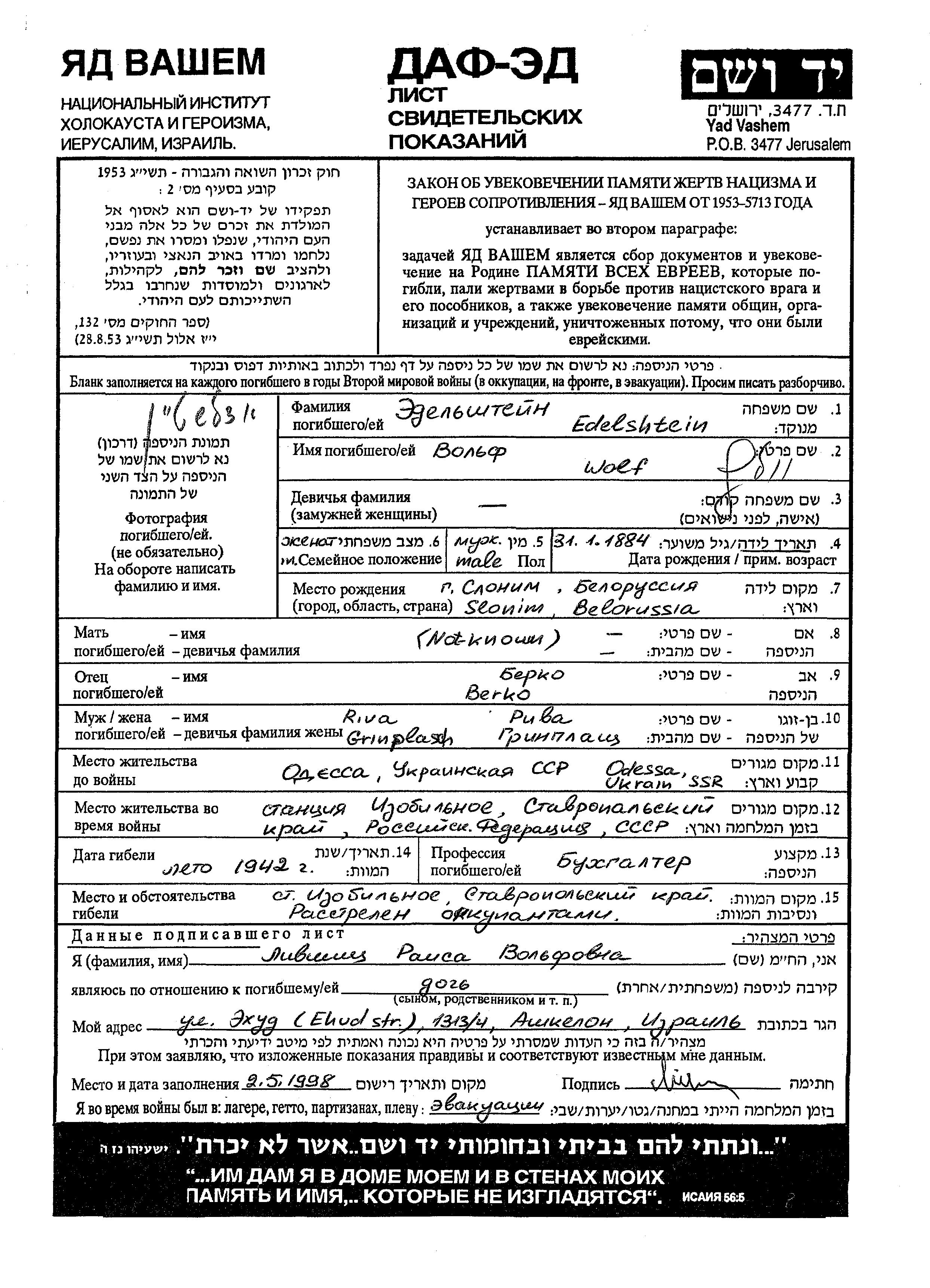 Wolf Edelshtein est né à Slonim, Pologne en 1884, fils de Berko. Il était Comptable et Mariée à Riva née Grinplashch. Avant la seconde guerre mondiale il vivait à Odessa, Ukraine (URSS). Au cours de la guerre, il était à Izobilnoye, Russie (URSS).