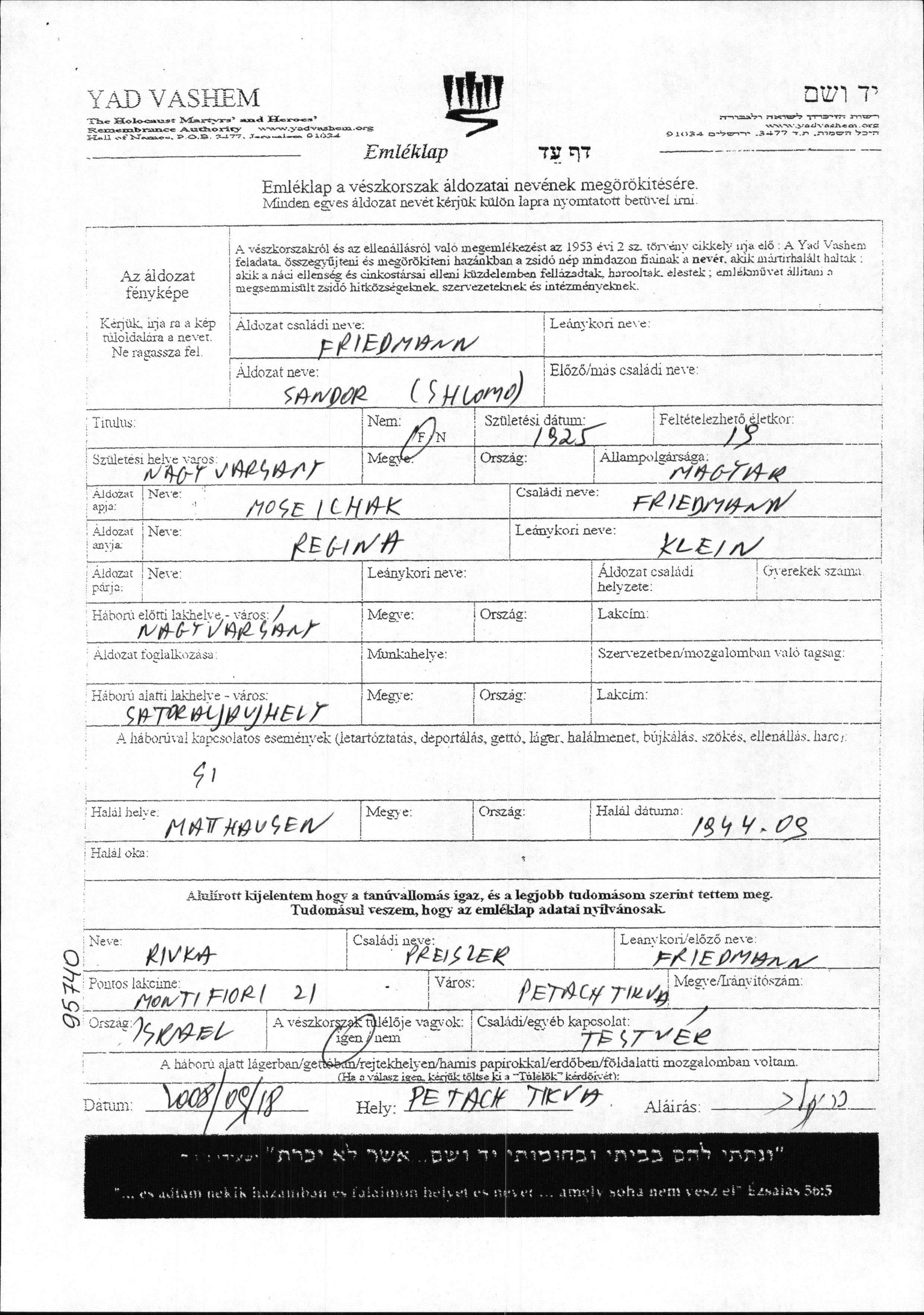 Friedmann Sandor Shlomo 1925 Nagyvarsany, Hongrie Feuille de témoignage