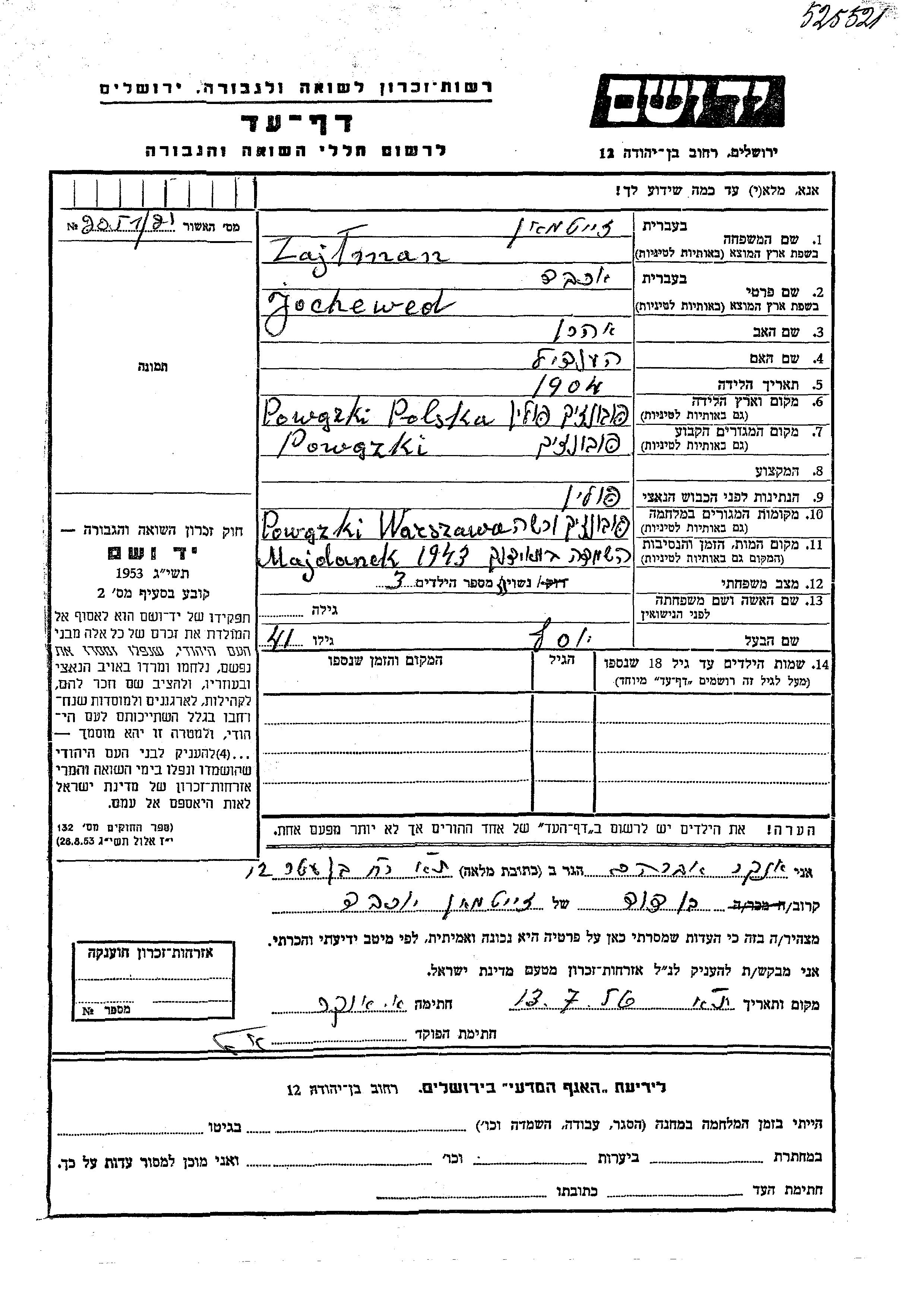 Zajtman Jochewed 1904 Powonski, Pologne Feuille de témoignage
