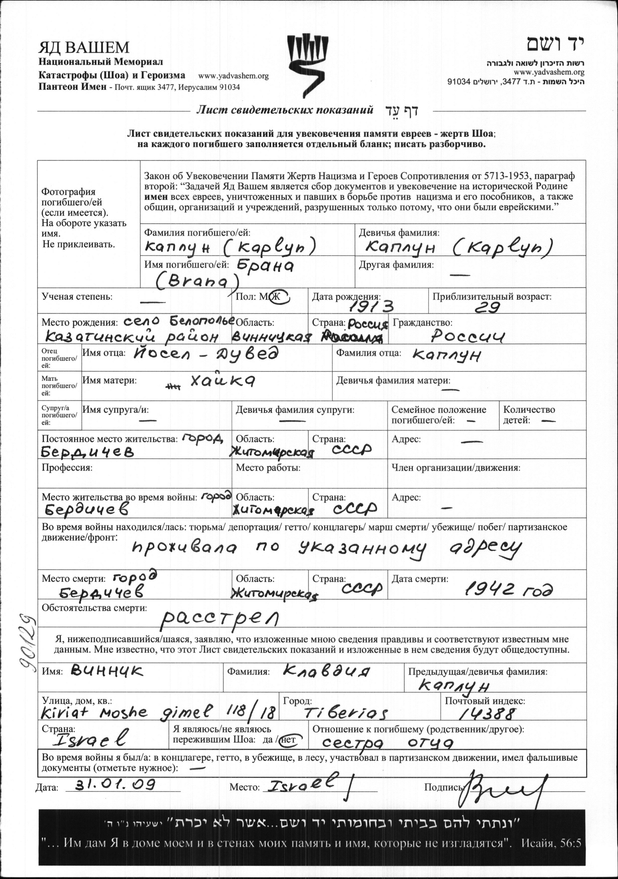Kaplun Brana 1913 Berdichev, Ukraine (URSS) Feuille de témoignage