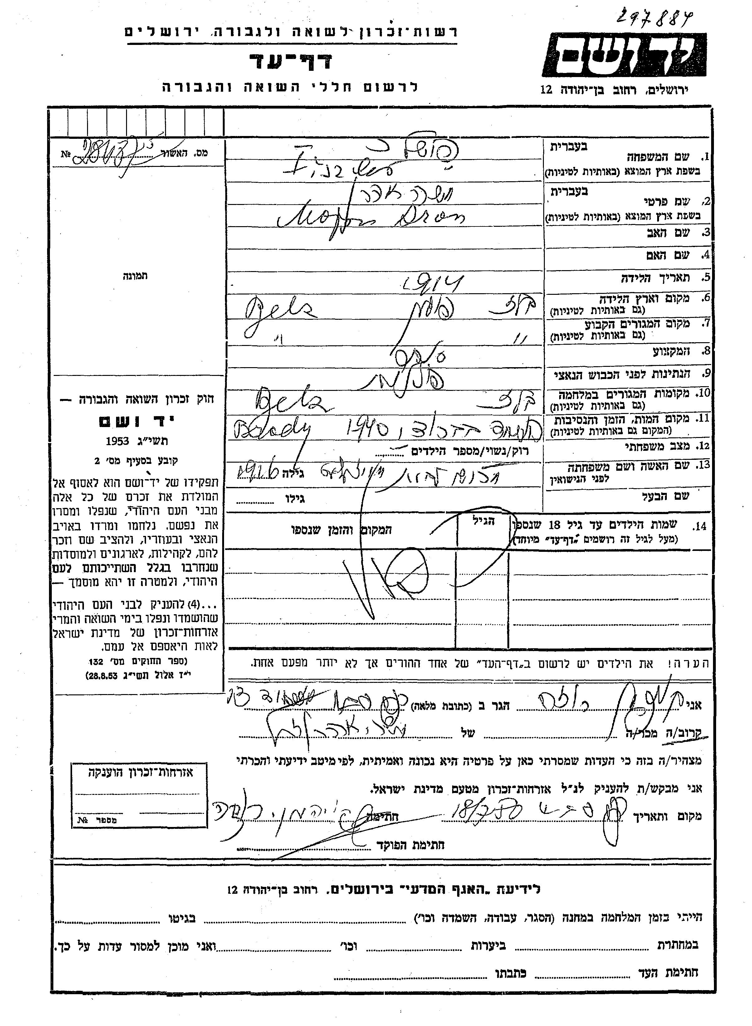 Fisler Moshe Aron 1914 Belz, Pologne Feuille de témoignage