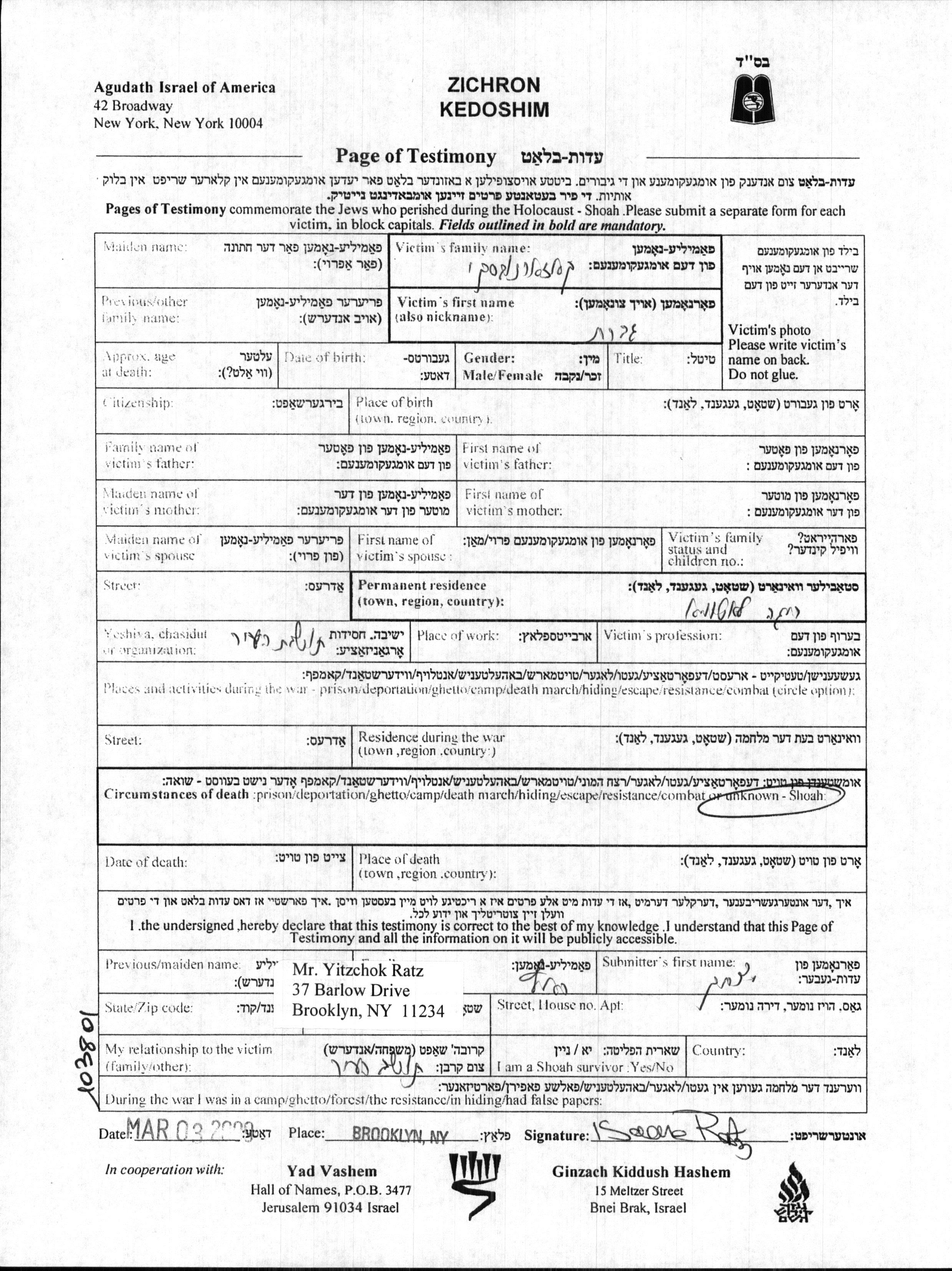 Yad Vashem - Pages of Testimony Names Memorial Collection