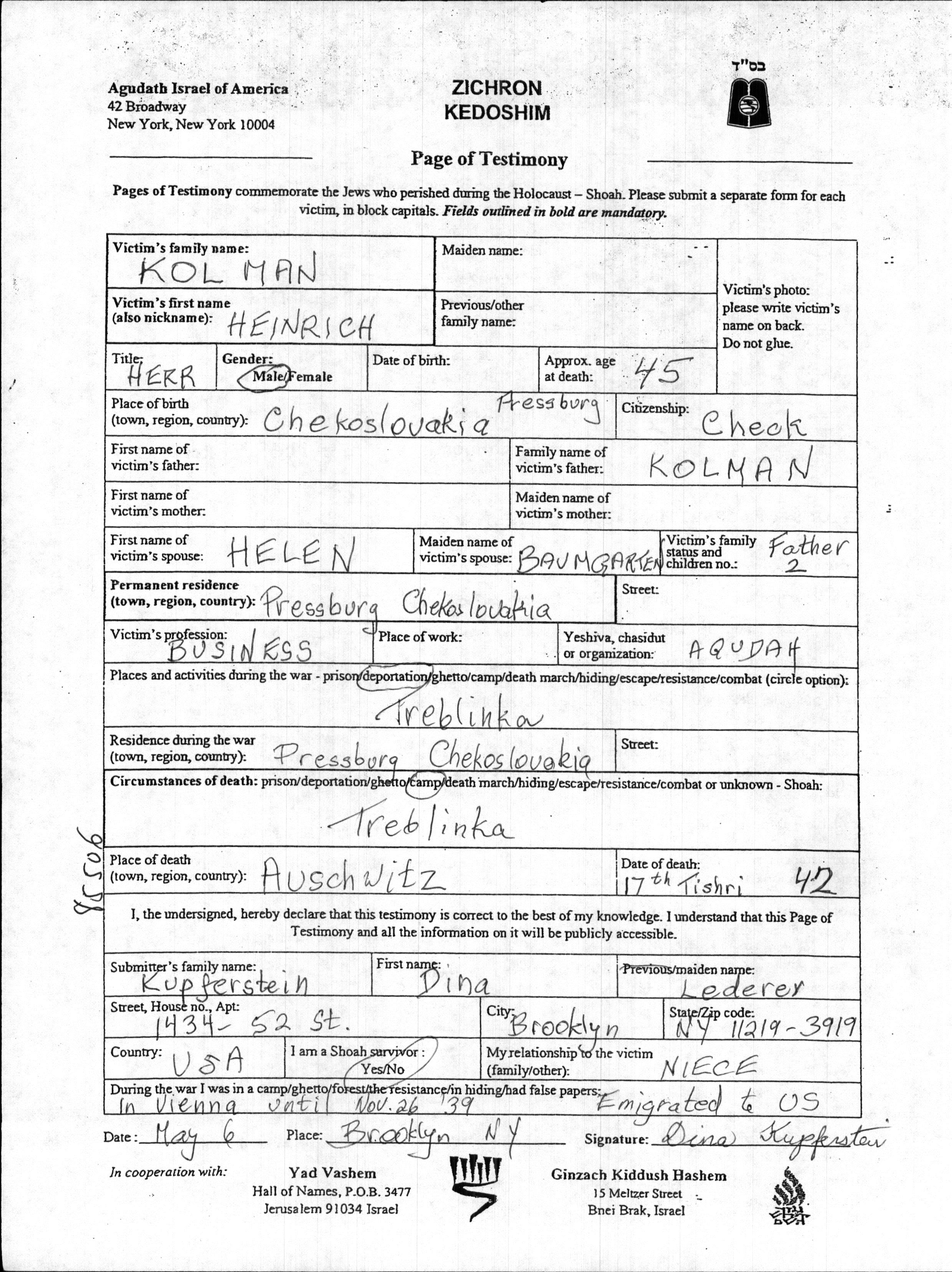 Kolman Heinrich Pressburg, Tchécoslovaquie Feuille de témoignage