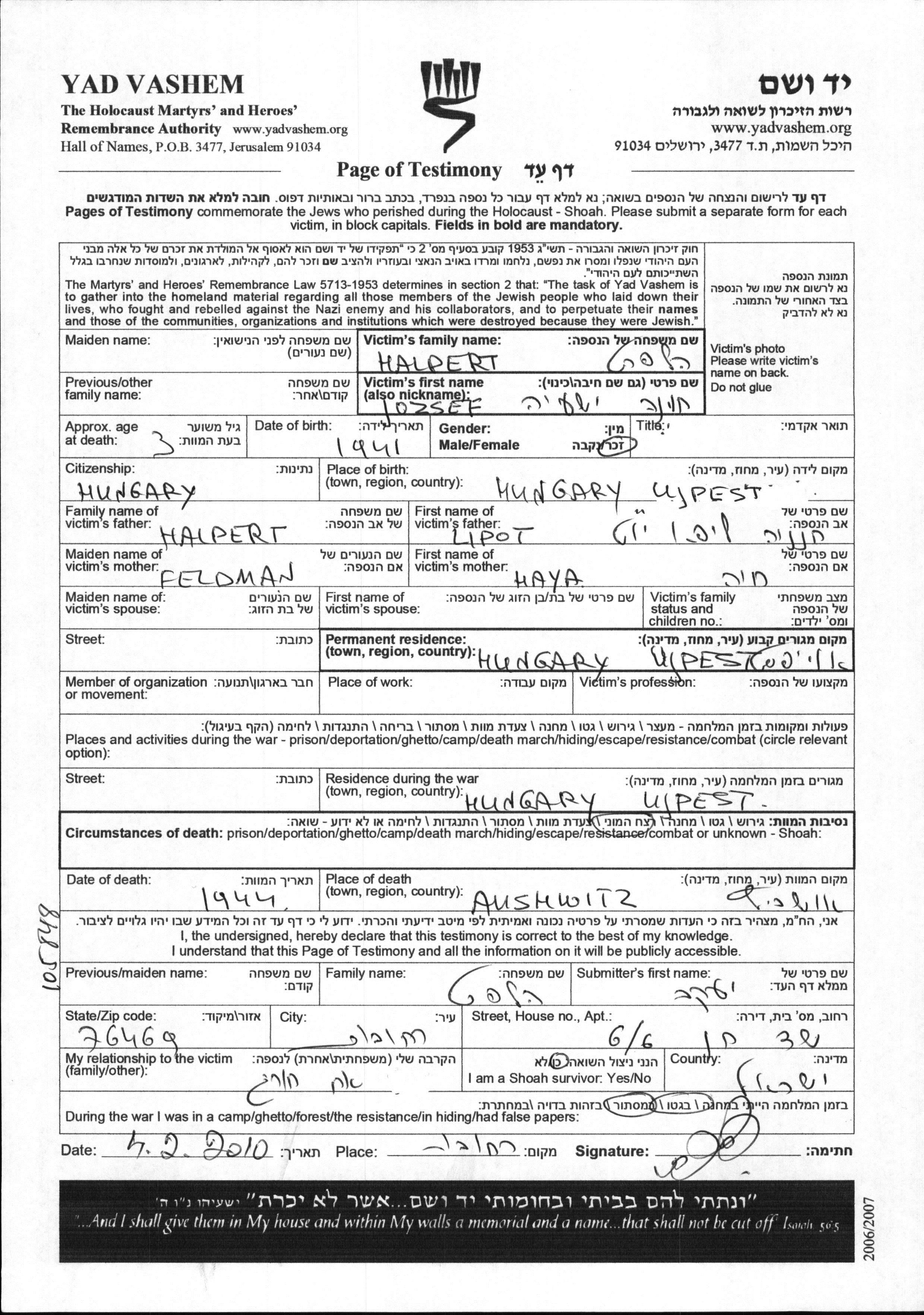Halpert Joszef Khona Yeshiyah 1941 Ujpest, Hongrie Feuille de témoignage