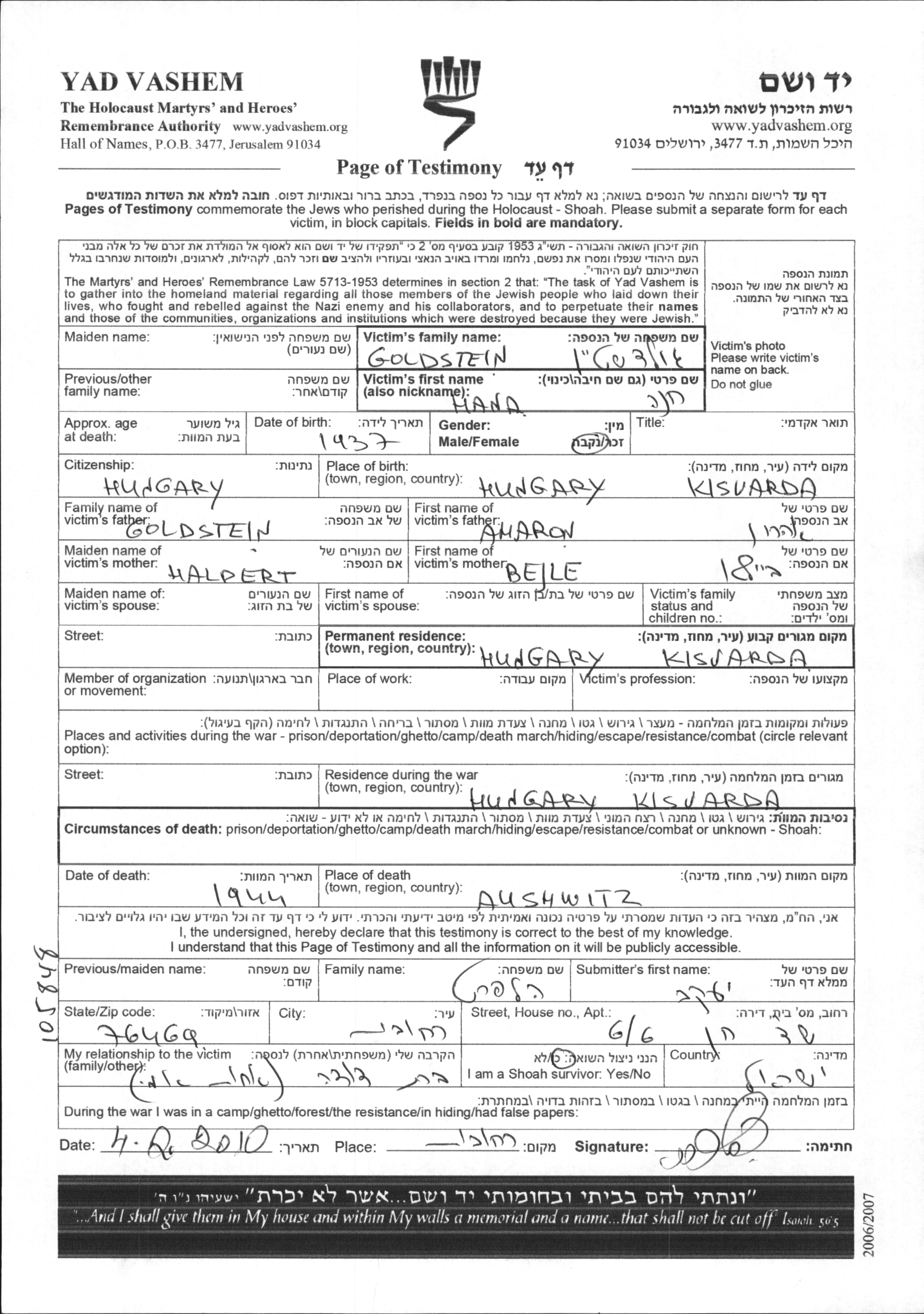 Yad Vashem - Pages of Testimony Names Memorial Collection