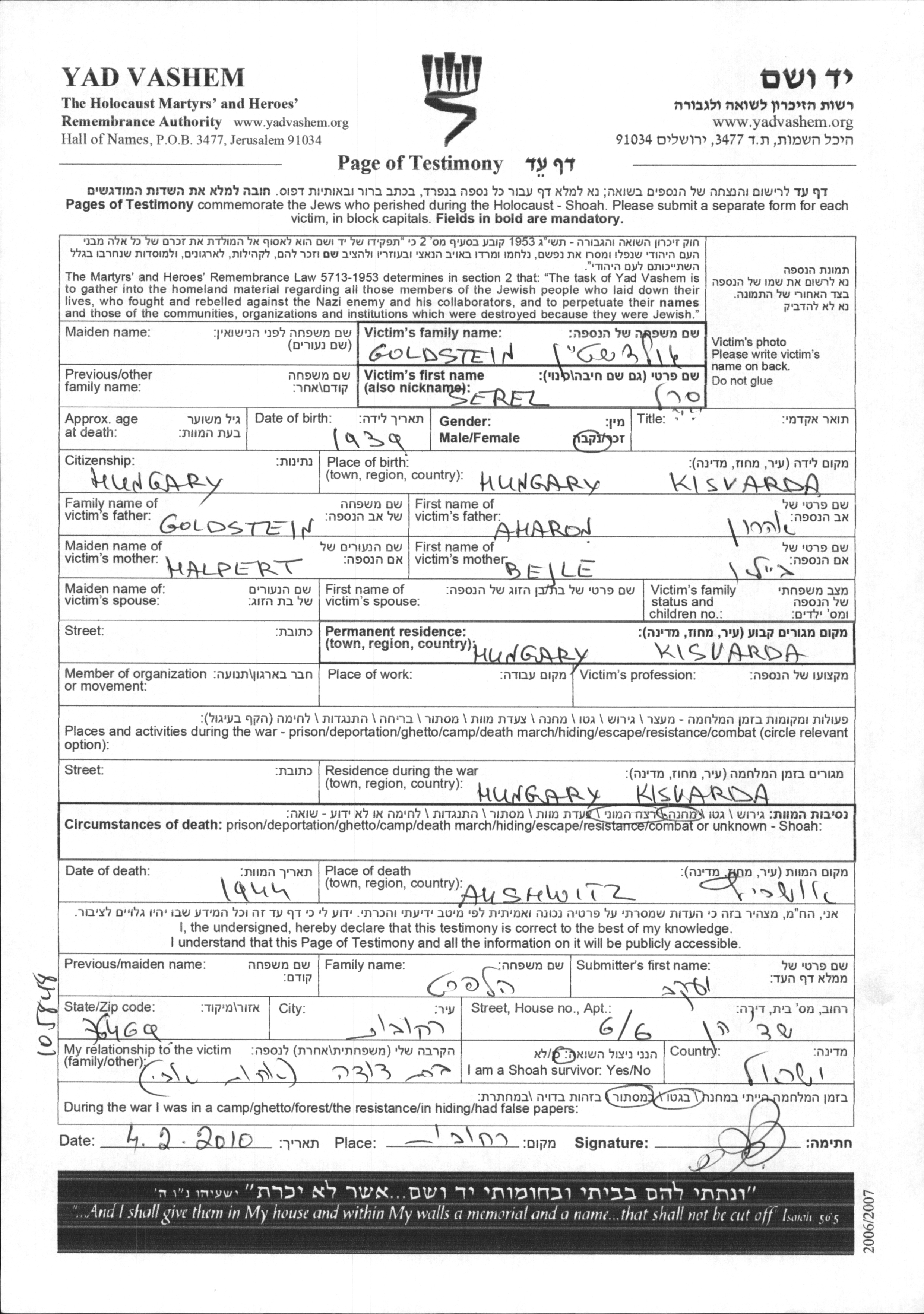 Yad Vashem - Pages of Testimony Names Memorial Collection