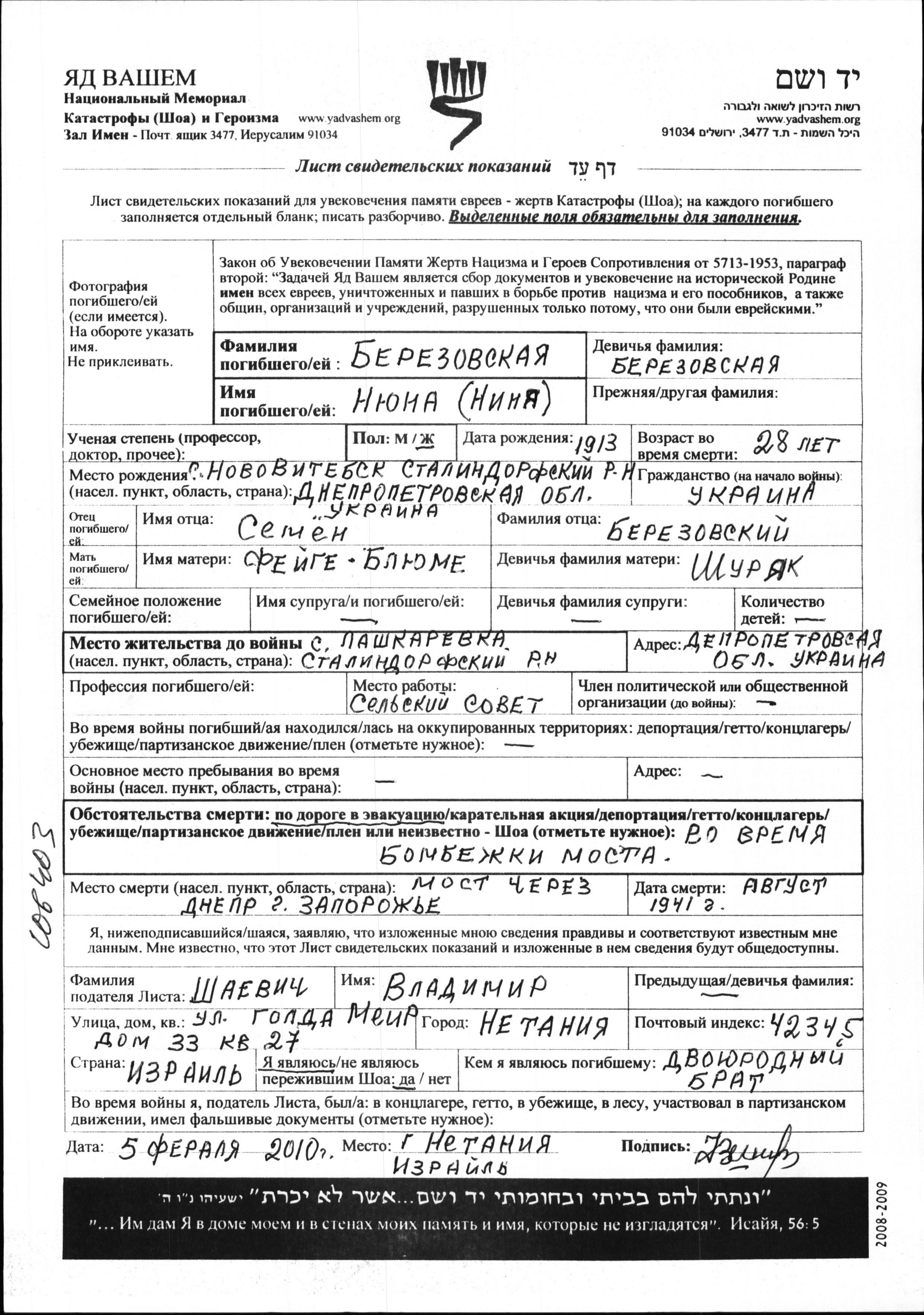 Berezovskaya Nyunya Nina 1913 Loshkarevka, Ukraine (URSS) Feuille de témoignage