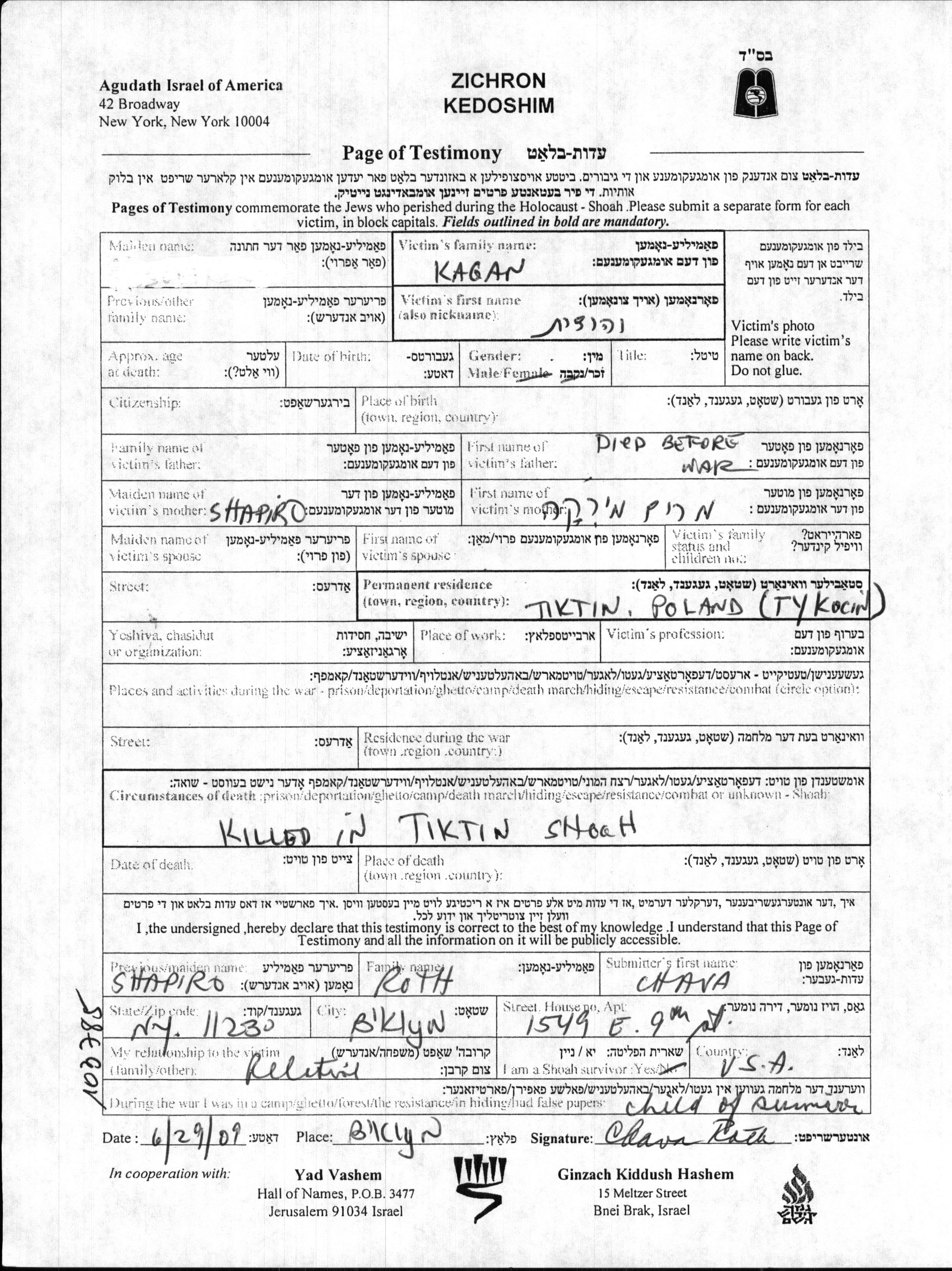 Kagan Yehudit Tykocin, Pologne Feuille de témoignage