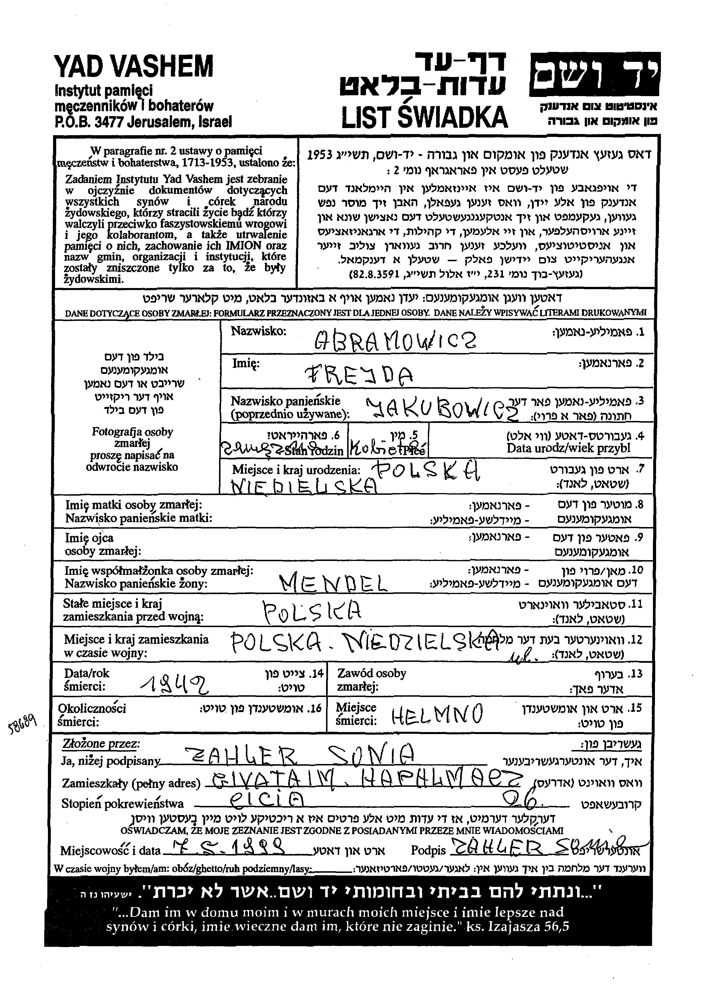 Abramowicz Frejda Pologne Feuille de témoignage