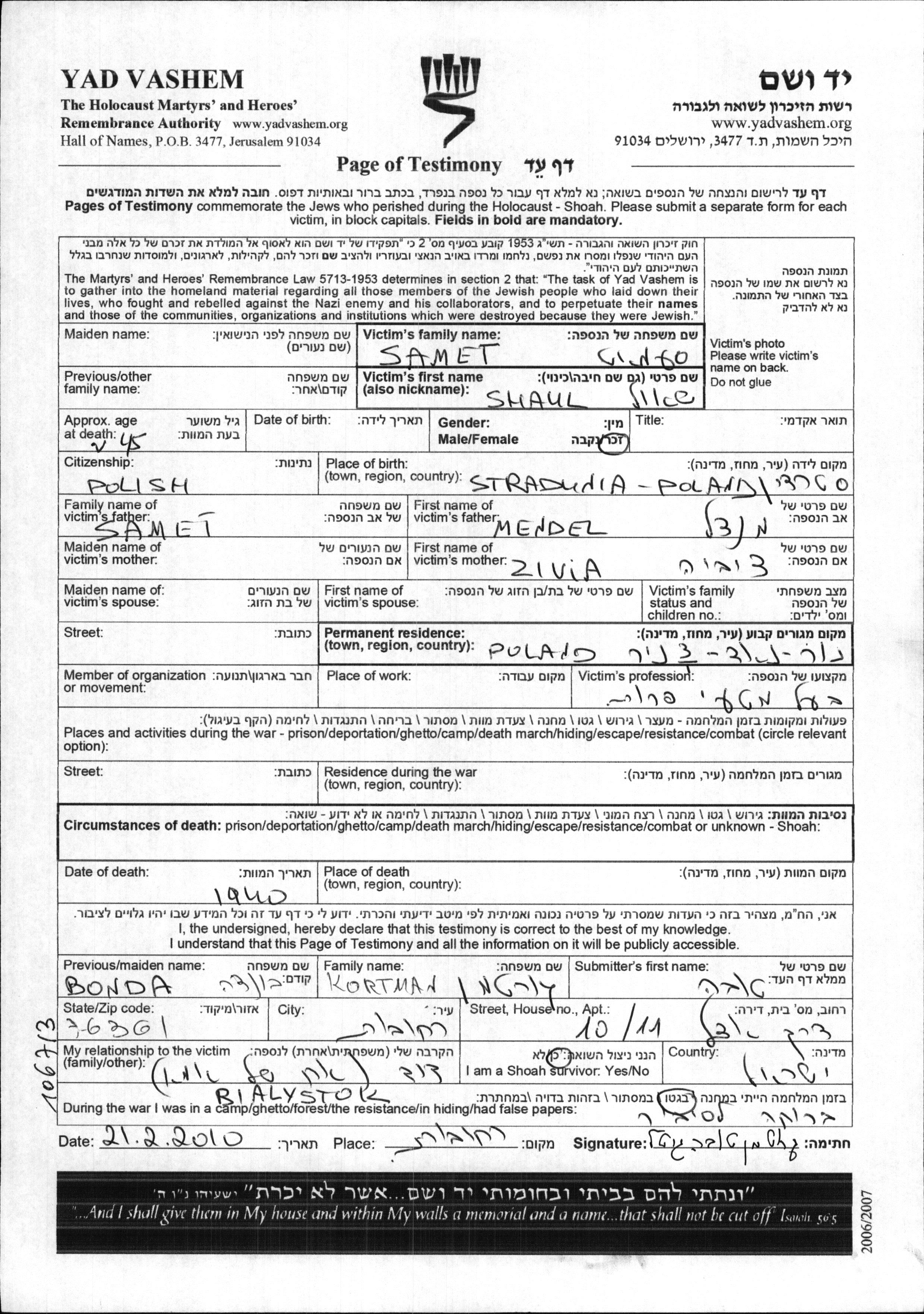 Samet Shaul Nur, Pologne Feuille de témoignage