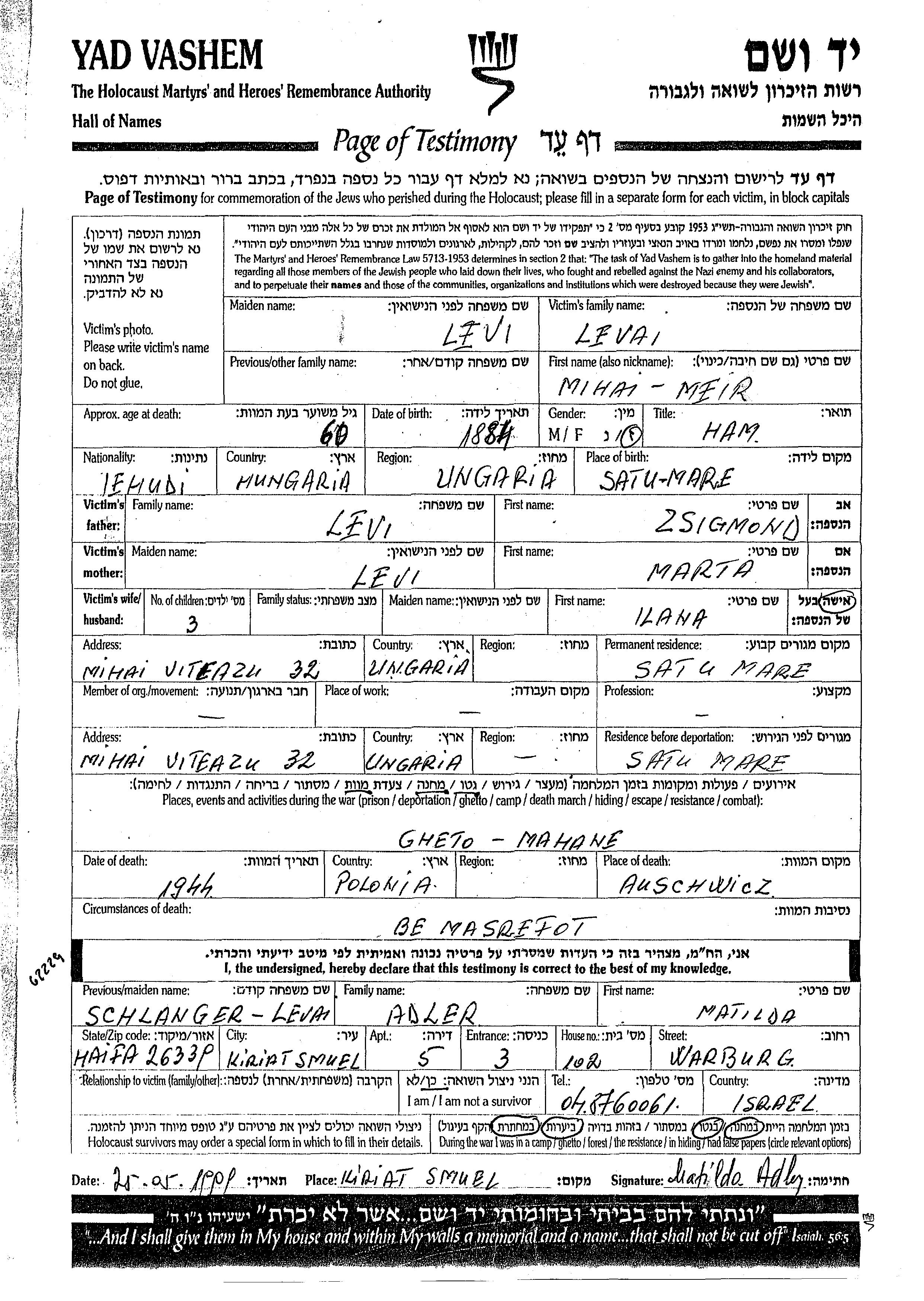 Levai Mihai Meir 1884 Satu Mare, Roumanie Feuille de témoignage