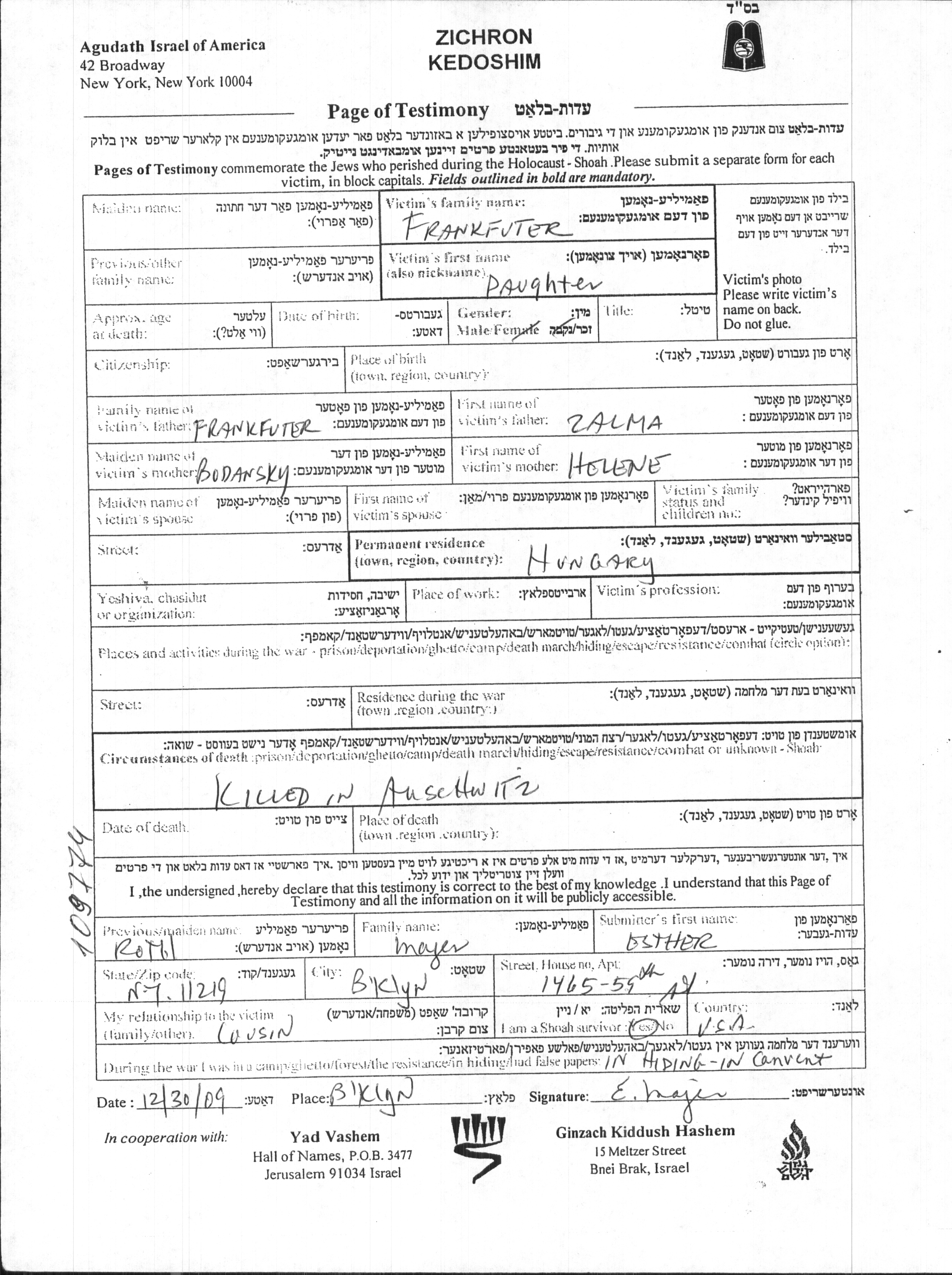 Frankfuter prénom inconnu Hongrie Feuille de témoignage