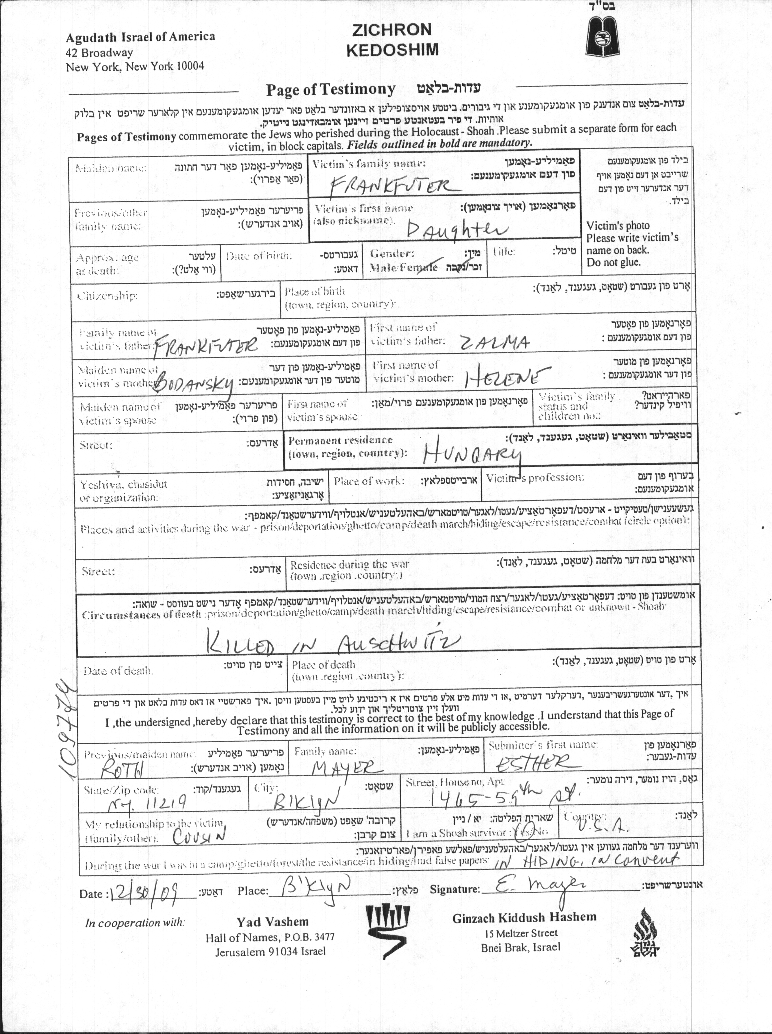 Frankfuter prénom inconnu Hongrie Feuille de témoignage