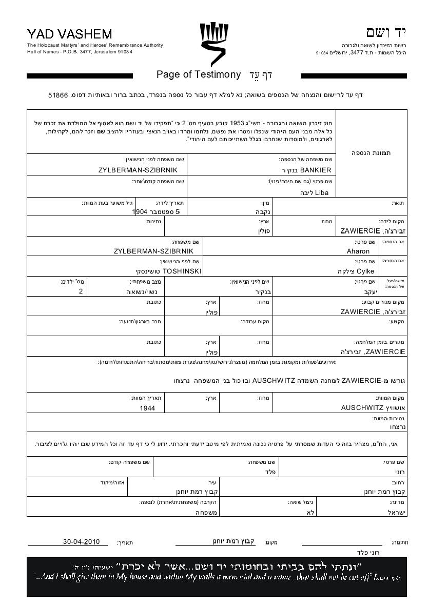 Liba Bankier née Zylberman Szibrnik est née à Zawiercie, Pologne en 1904, fille de Aharon et de Cylke née Toshinski. Elle était Mariée à Yaakov. Avant la seconde guerre mondiale elle vivait à Zawiercie, Pologne. Pendant la guerre, elle était à Zawiercie, Pologne.