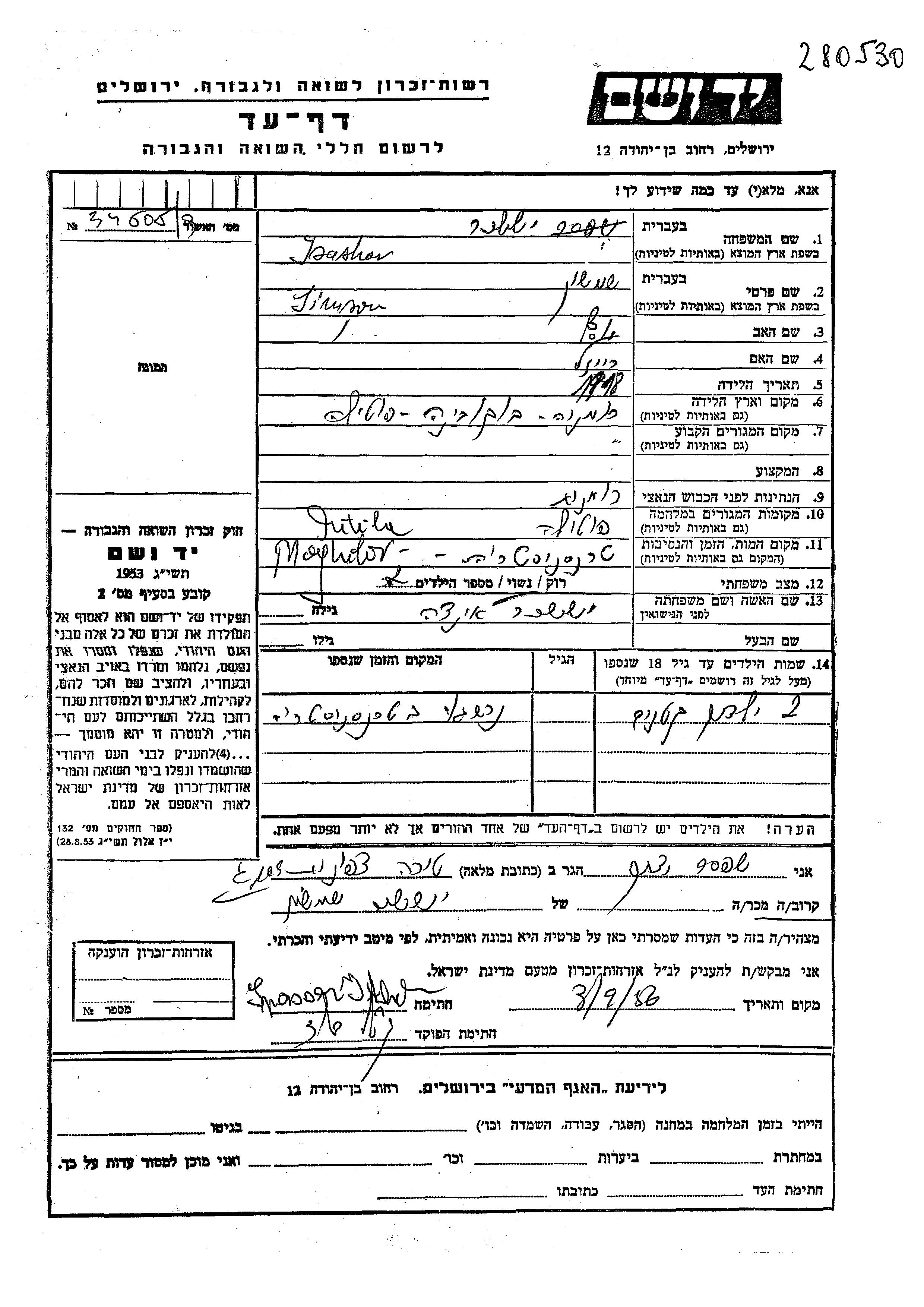 Jsashar Shimshon 1918 endroit inconnu, Feuille de témoignage