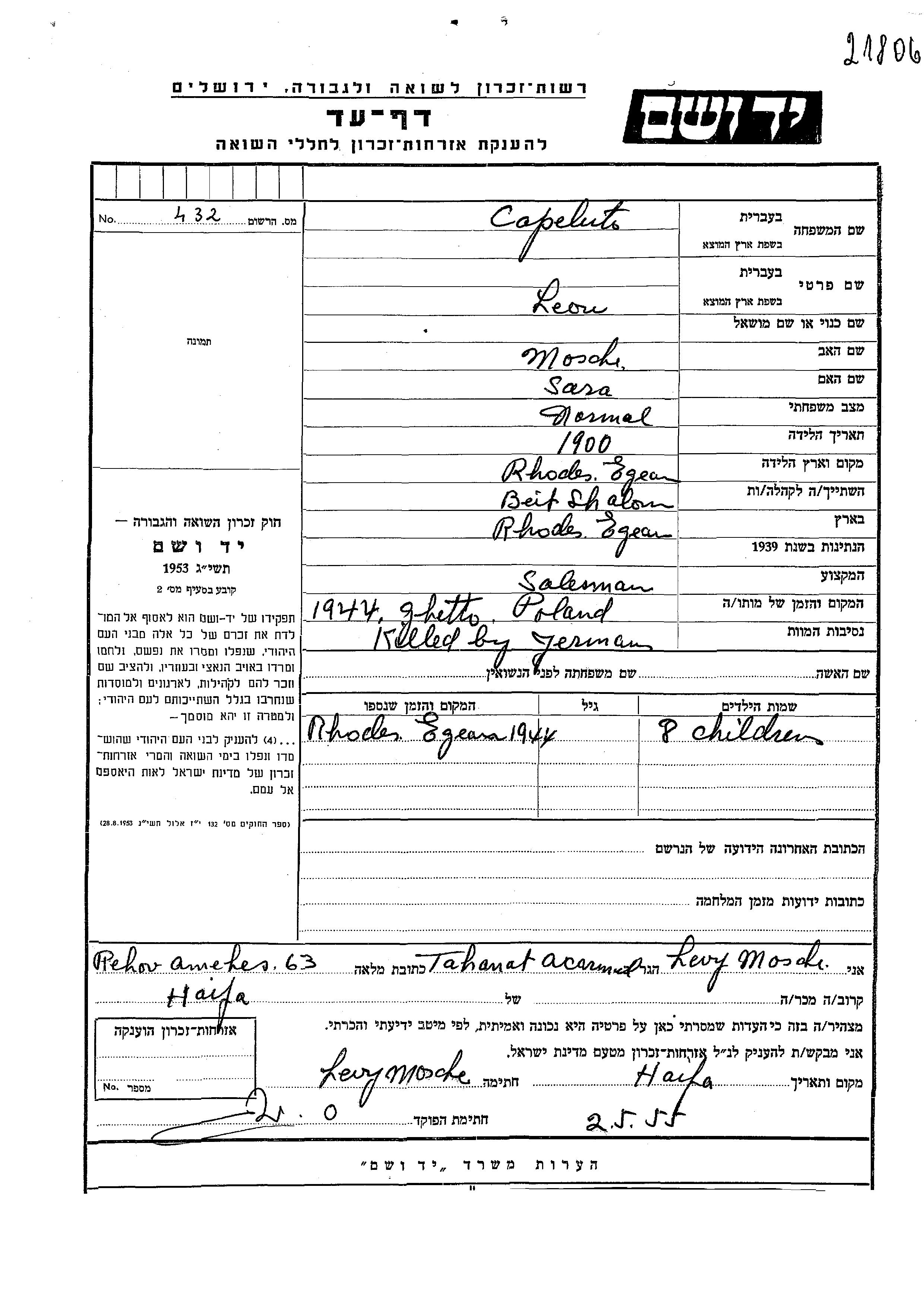 Leon Capeluto est né à Rodi, Italie en 1900, fils de Mosche et de Sara. Il était Vendeur/vendeuse et Marié. Avant la seconde guerre mondiale il vivait à Rodi, Italie.