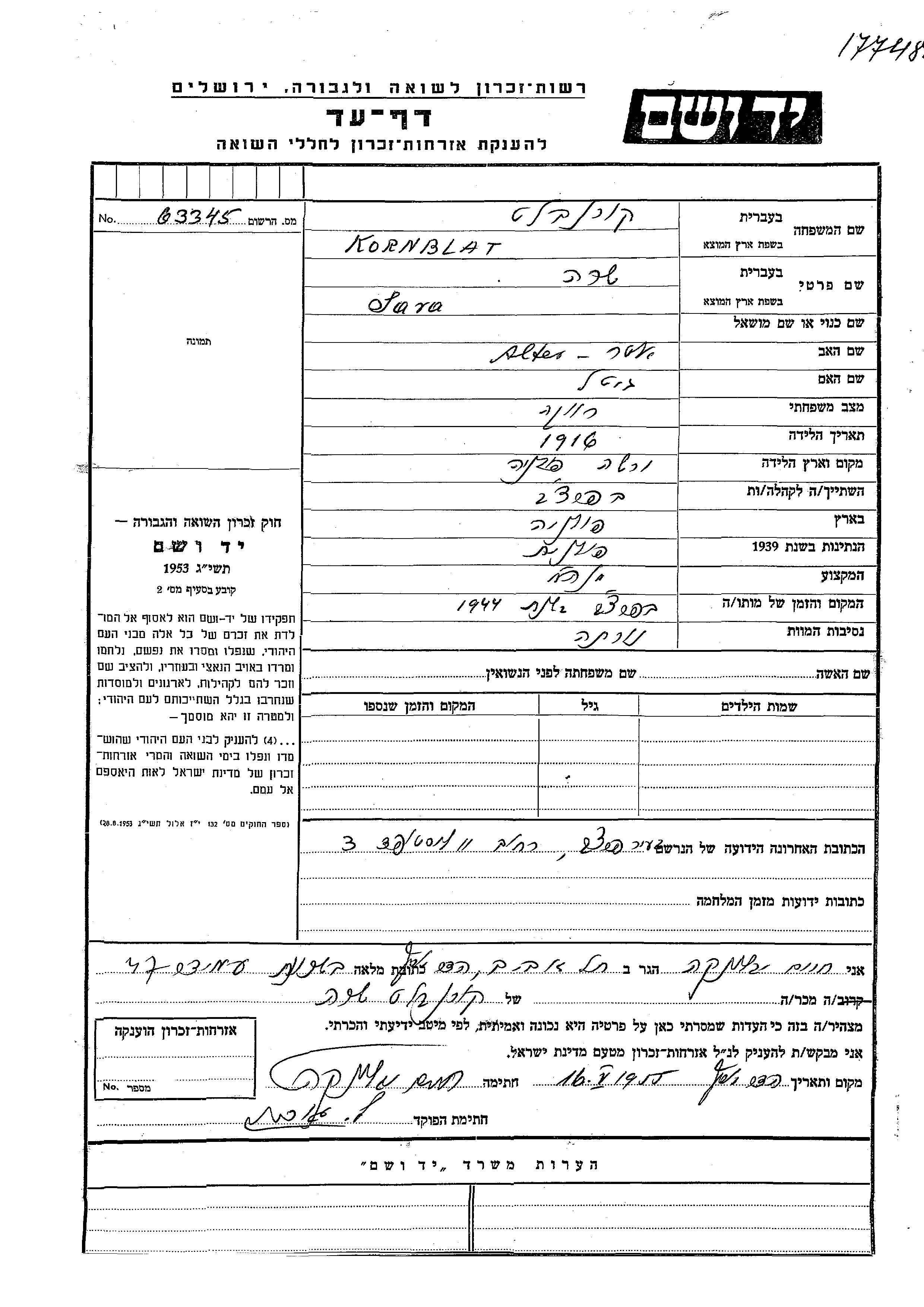 Kornblat Sara 1916 Parczew, Pologne Feuille de témoignage