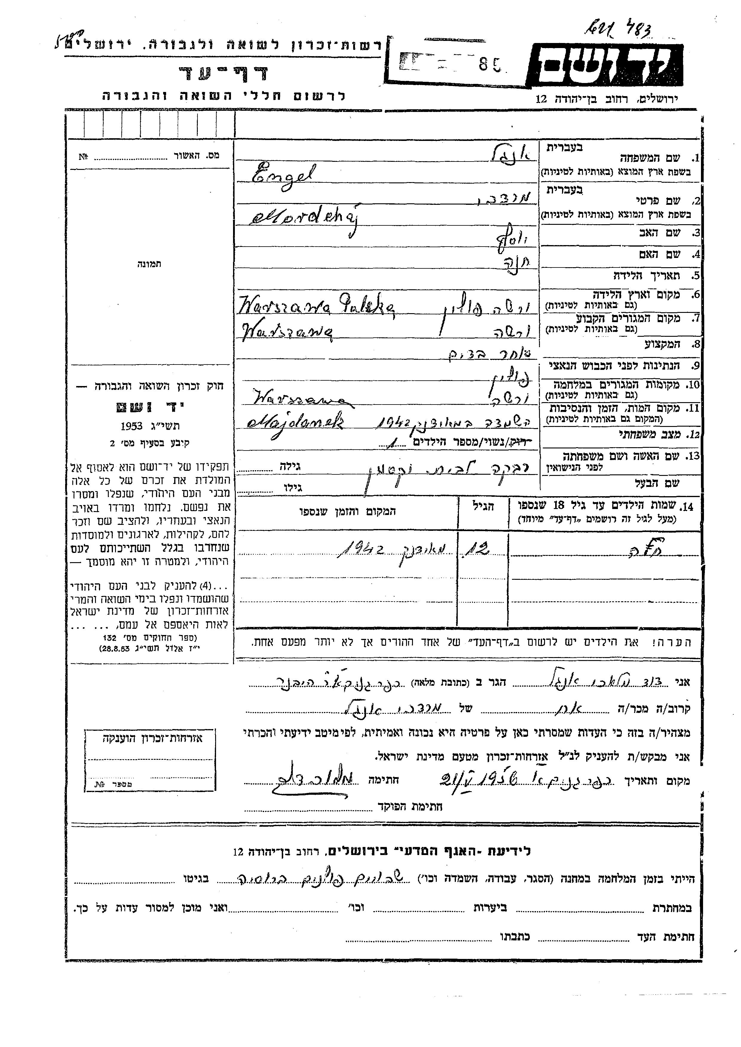 Engel Mordchai Warszawa, Pologne Feuille de témoignage