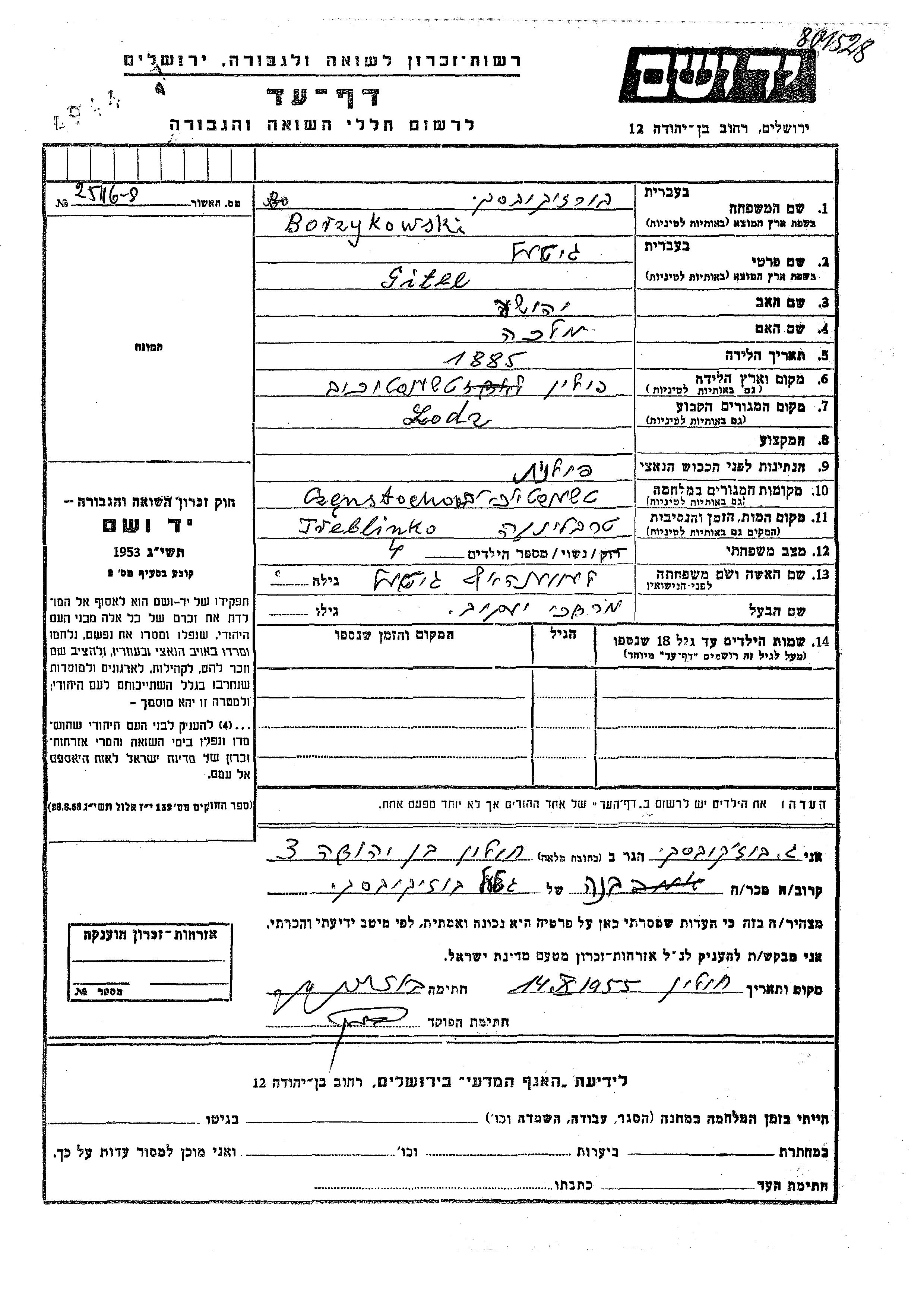 Borzykowski Gitel 1885 Lodz, Pologne Feuille de témoignage