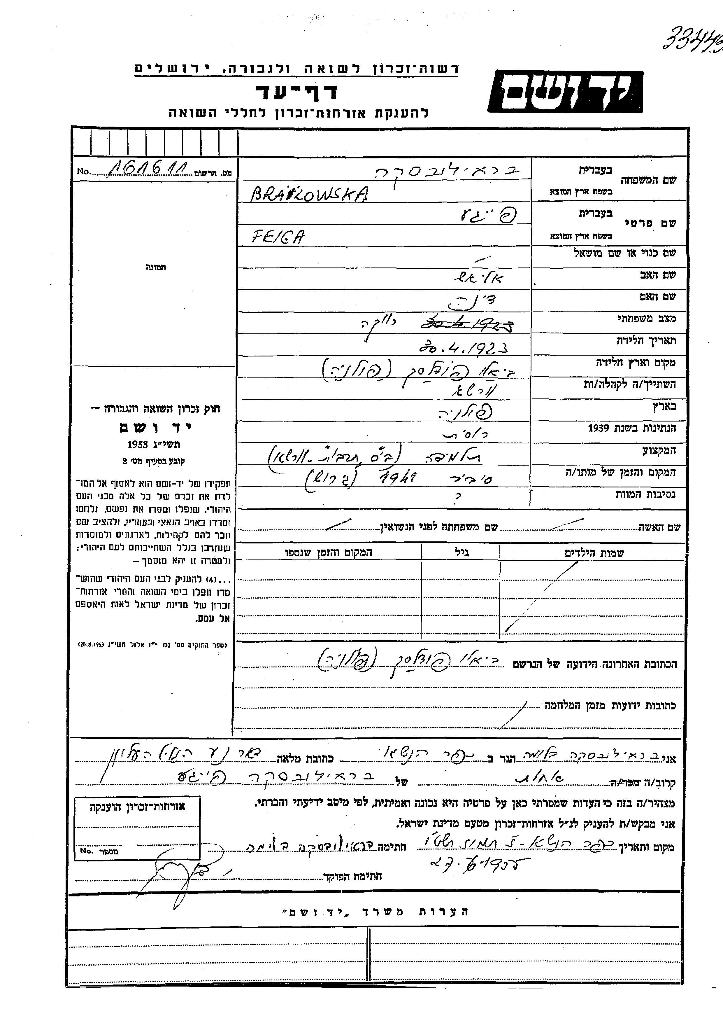 Brailowska Feige 1923 endroit inconnu, Feuille de témoignage
