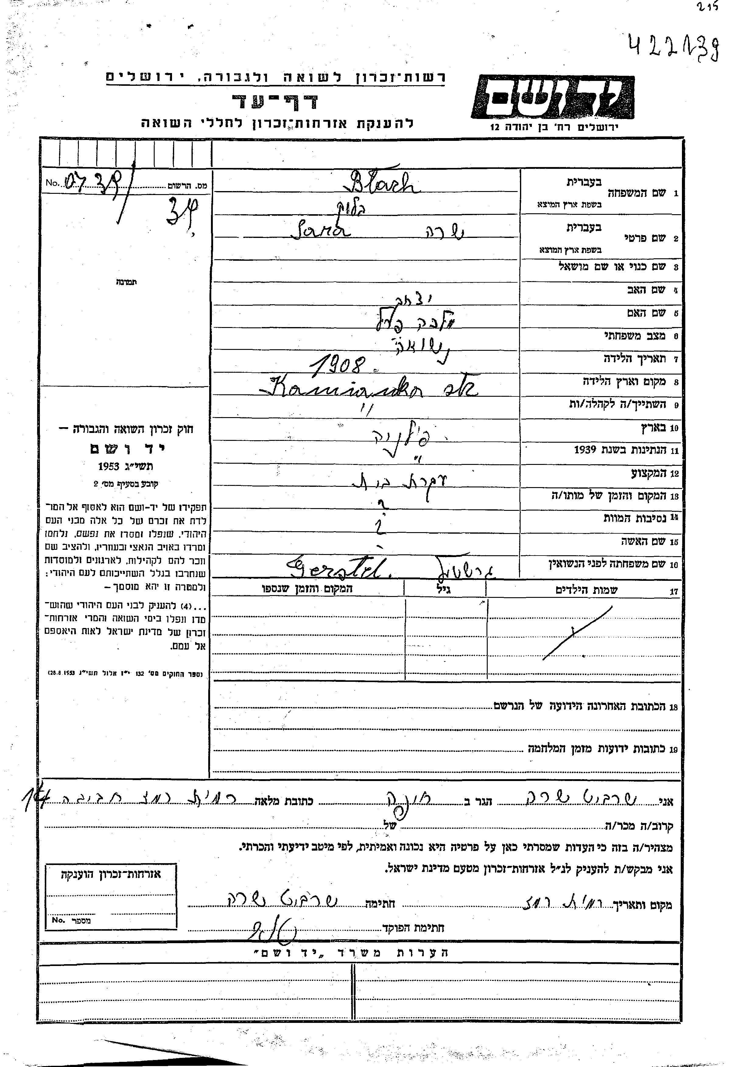 Bloch Sara 1908 Kamianka Strumilowa, Pologne Feuille de témoignage