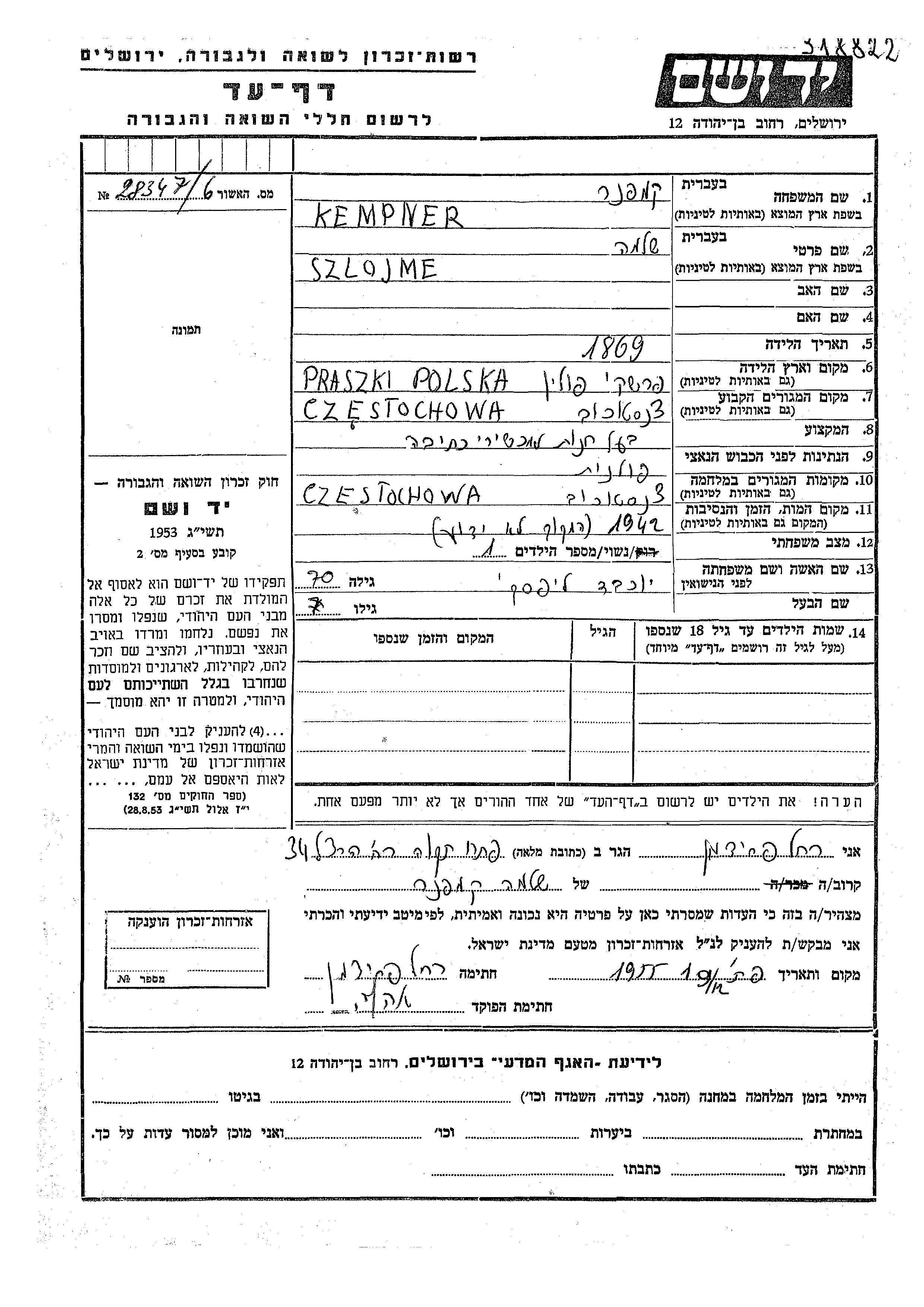 Szlojme Kempner est né à Praszki, Pologne en 1869. Il était Stationery store owner et Mariée à Yokheved née Lipski. Avant la seconde guerre mondiale il vivait à Czestochowa, Pologne. Au cours de la guerre, il était à Czestochowa, Pologne.