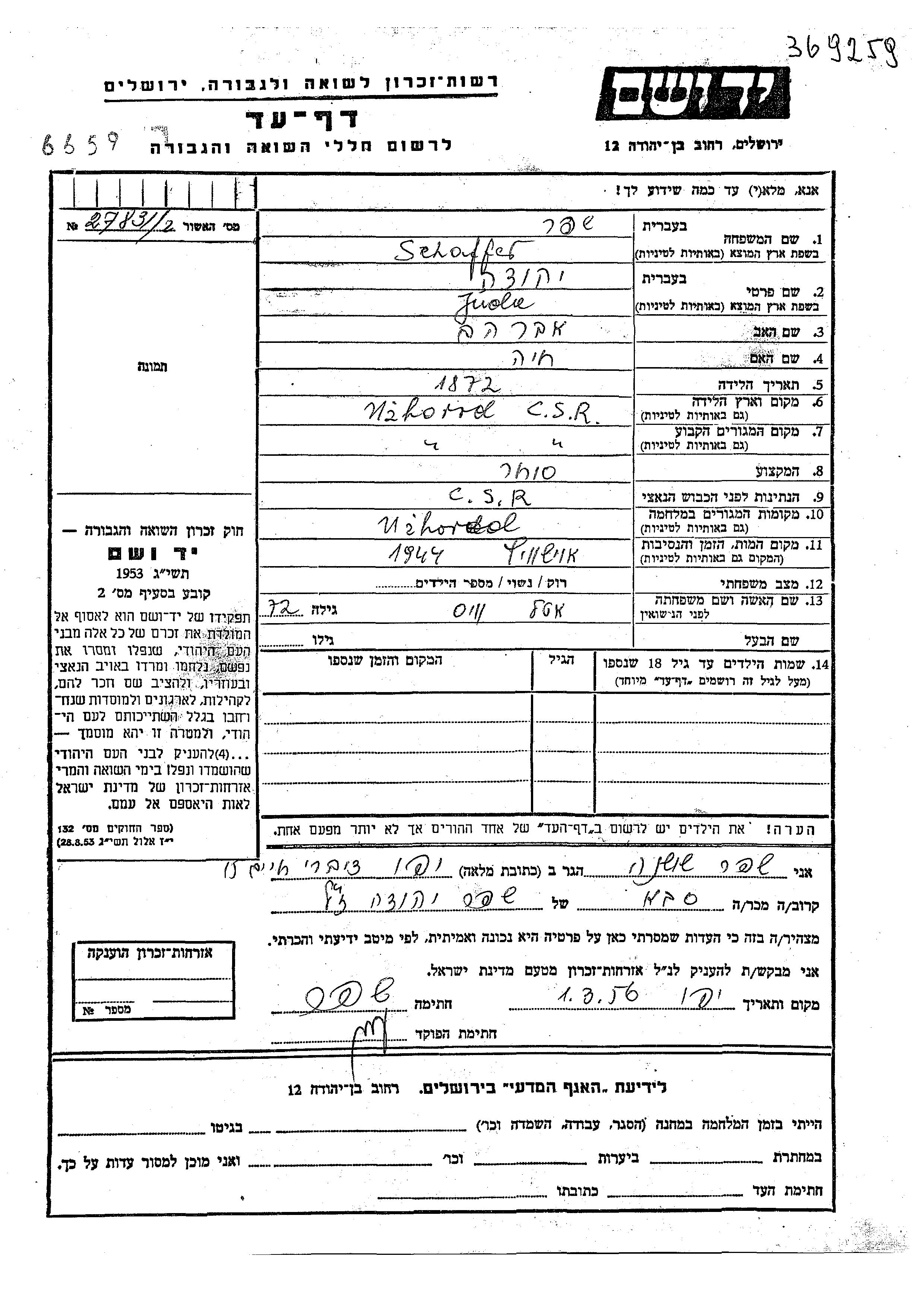 Schaffer Juda 1872 Uzhorod, Tchécoslovaquie Feuille de témoignage