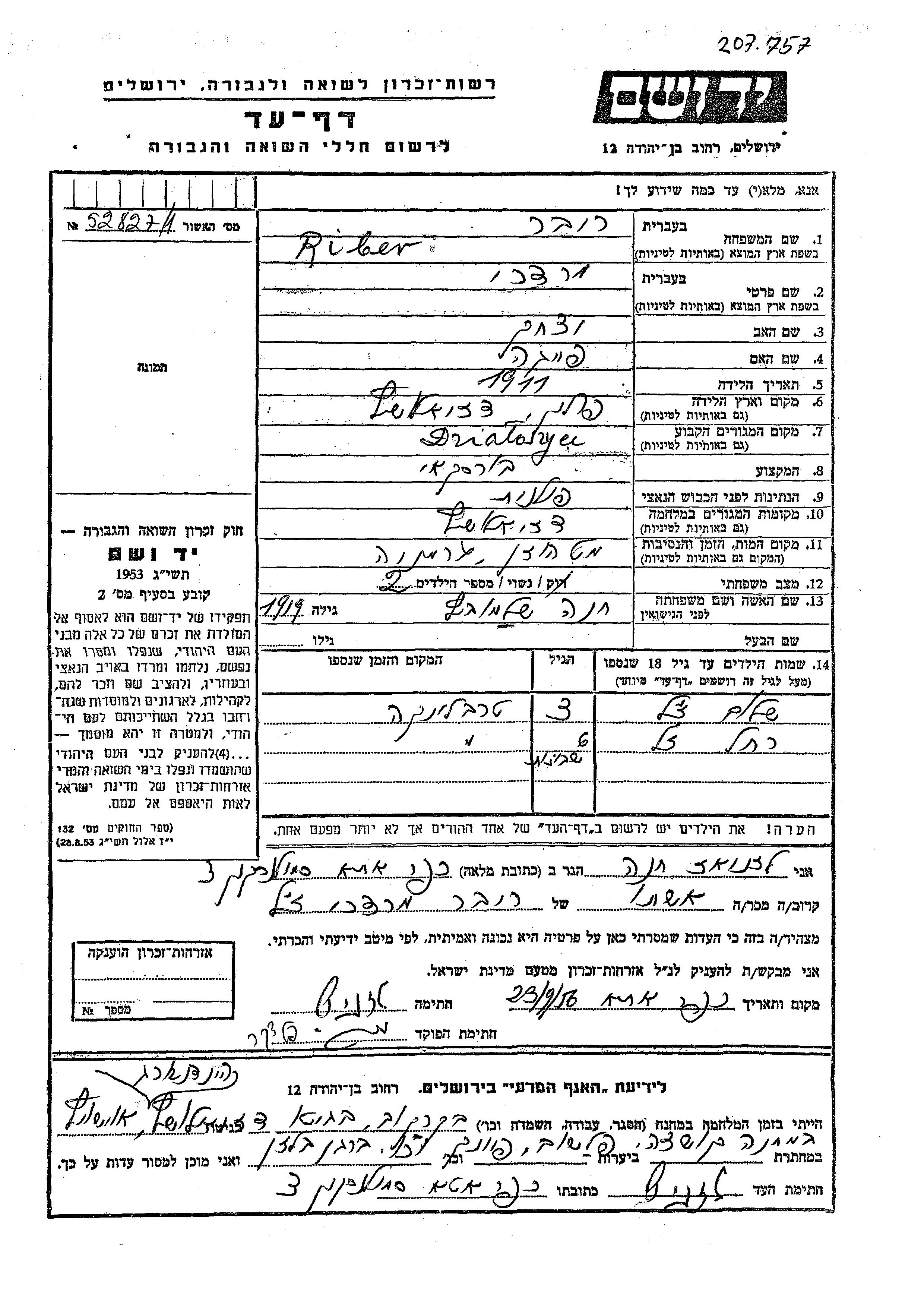Riber Mordekhai 1911 Dzialoszyce, Pologne Feuille de témoignage