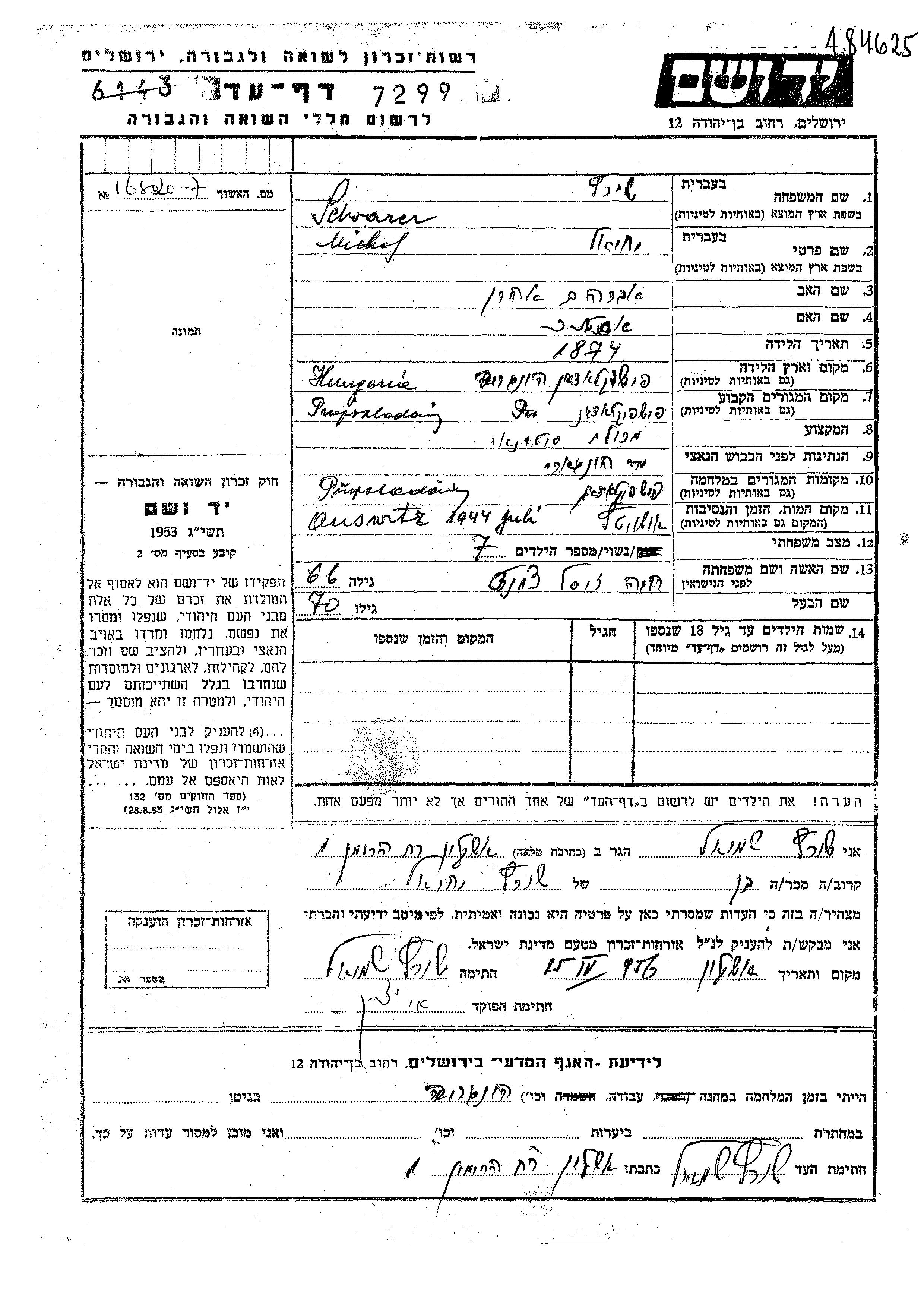 Scwarcz Michel Yekhiel 1874 Pispokledin, Hongrie Feuille de témoignage