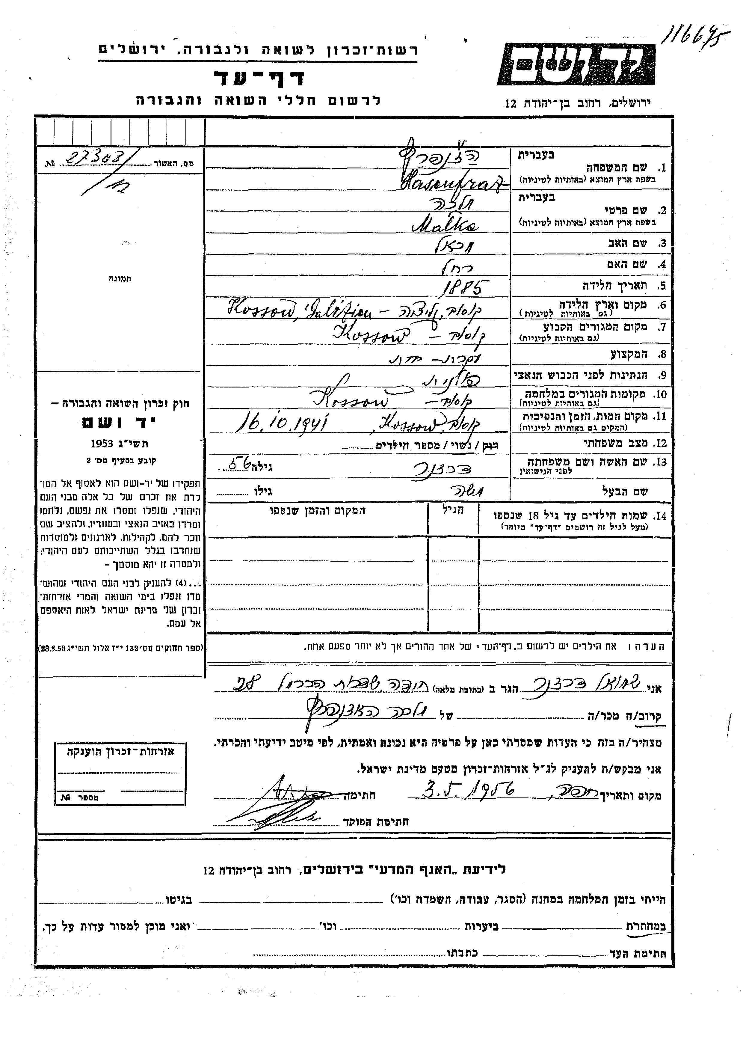 Malka a été assassinée pendant la Shoah. Lieu de la mort: Kosow, Pologne en 16/10/1941.