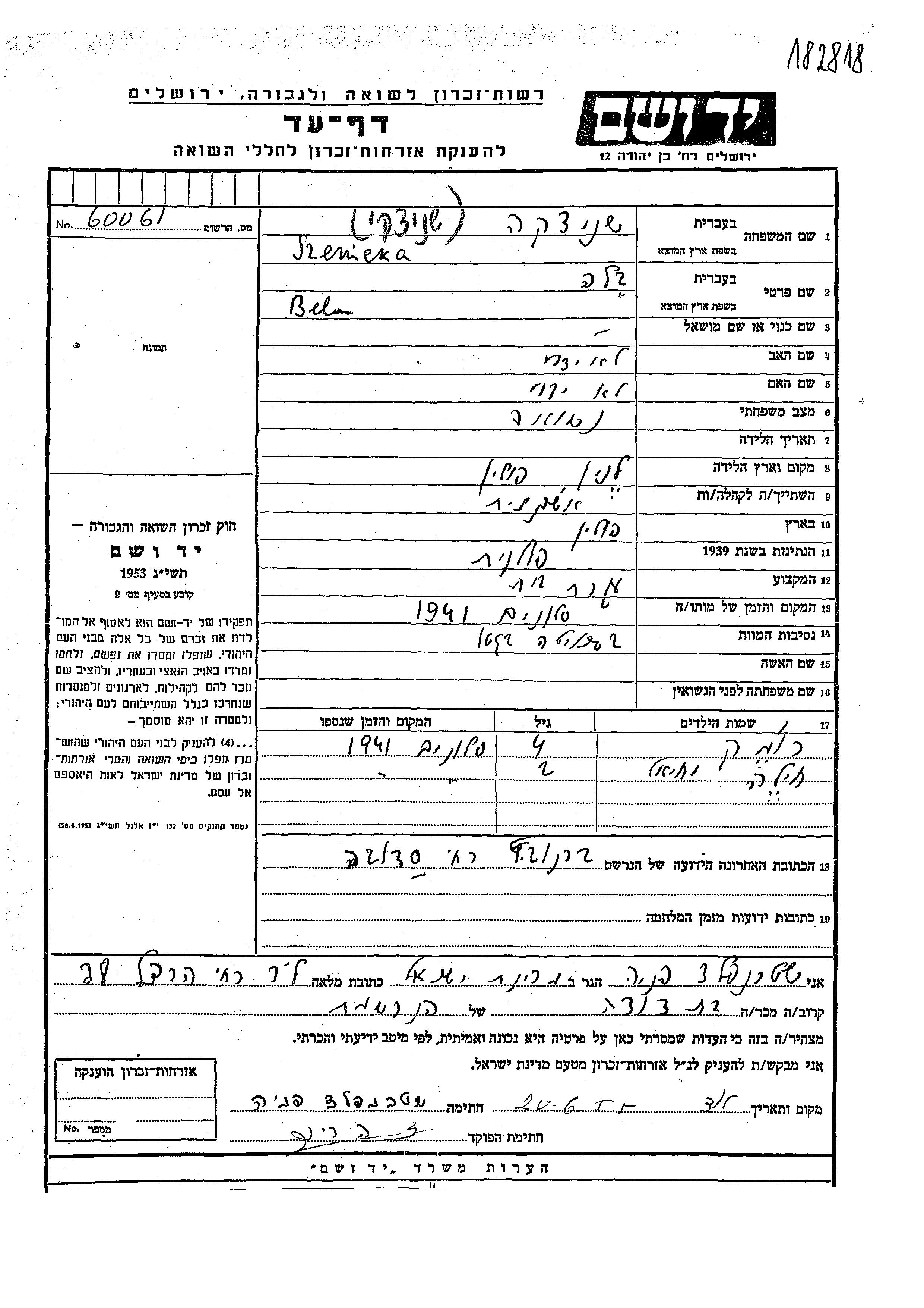 Bela a été assassinée pendant la Shoah. Lieu de la mort: Slonim, Pologne en 1941.