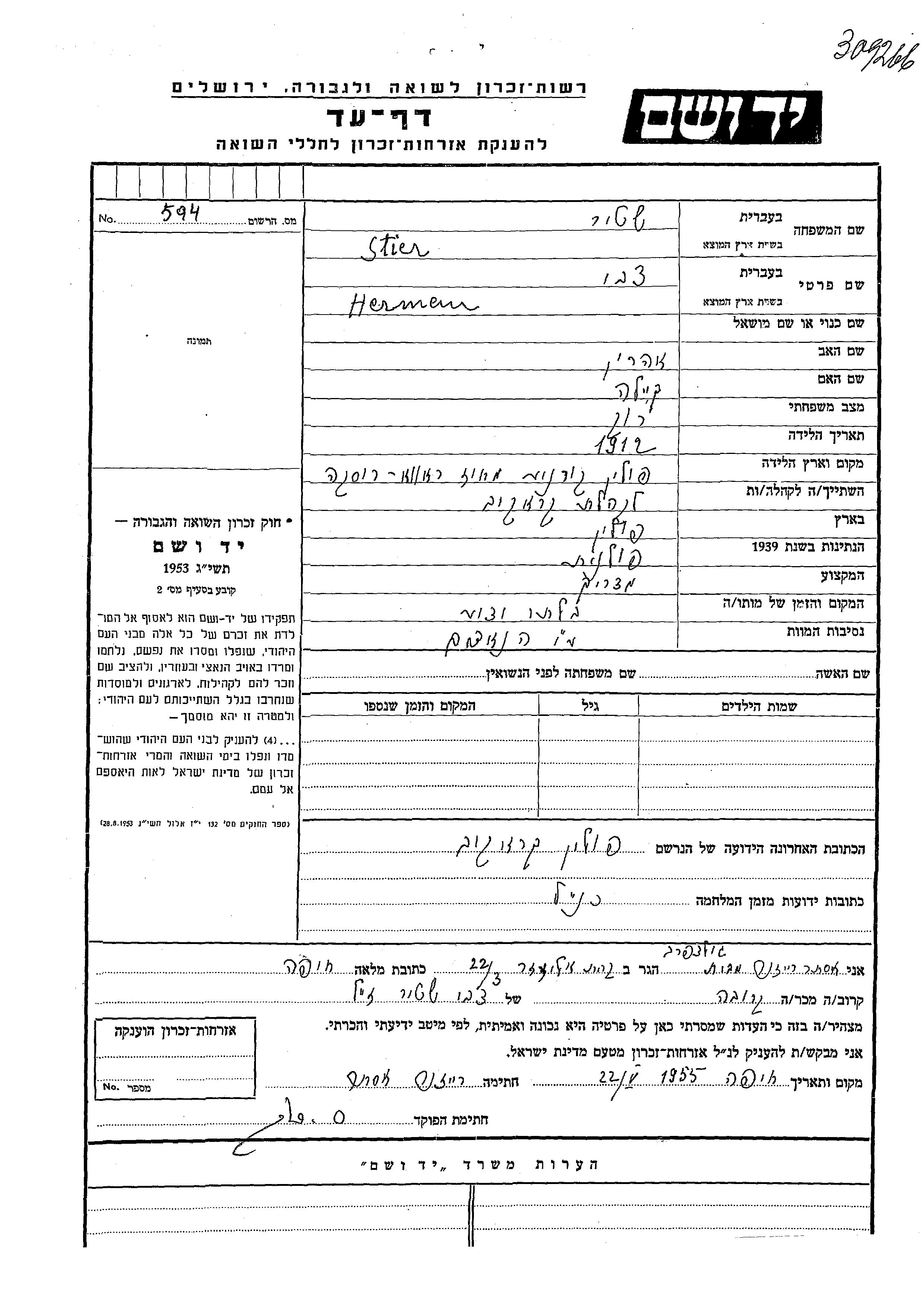 Stier Herman Tzvi 1912 Krakow, Pologne Feuille de témoignage