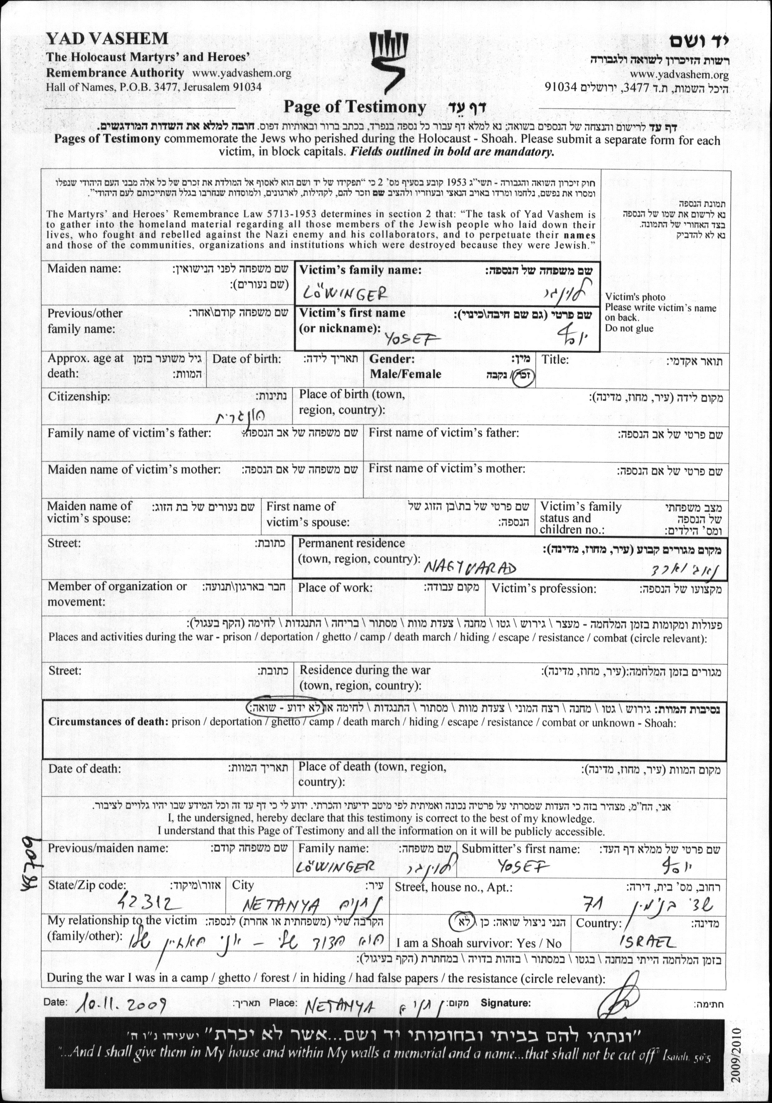 Levinger Yosef Nagy Varad, Roumanie Feuille de témoignage