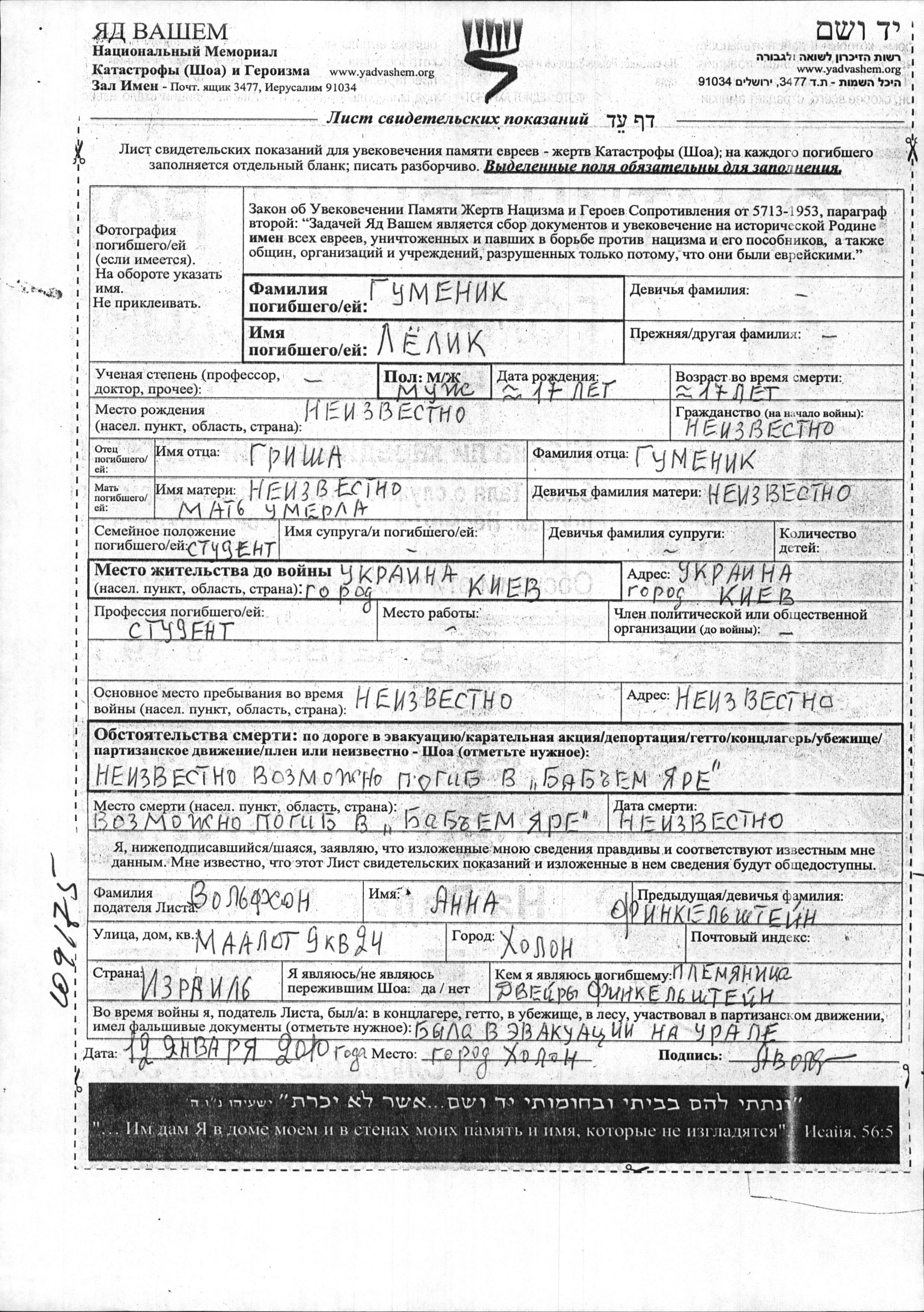 Lyolik a été assassiné pendant la Shoah. Lieu de la mort: Babi Yar, Ukraine (URSS).