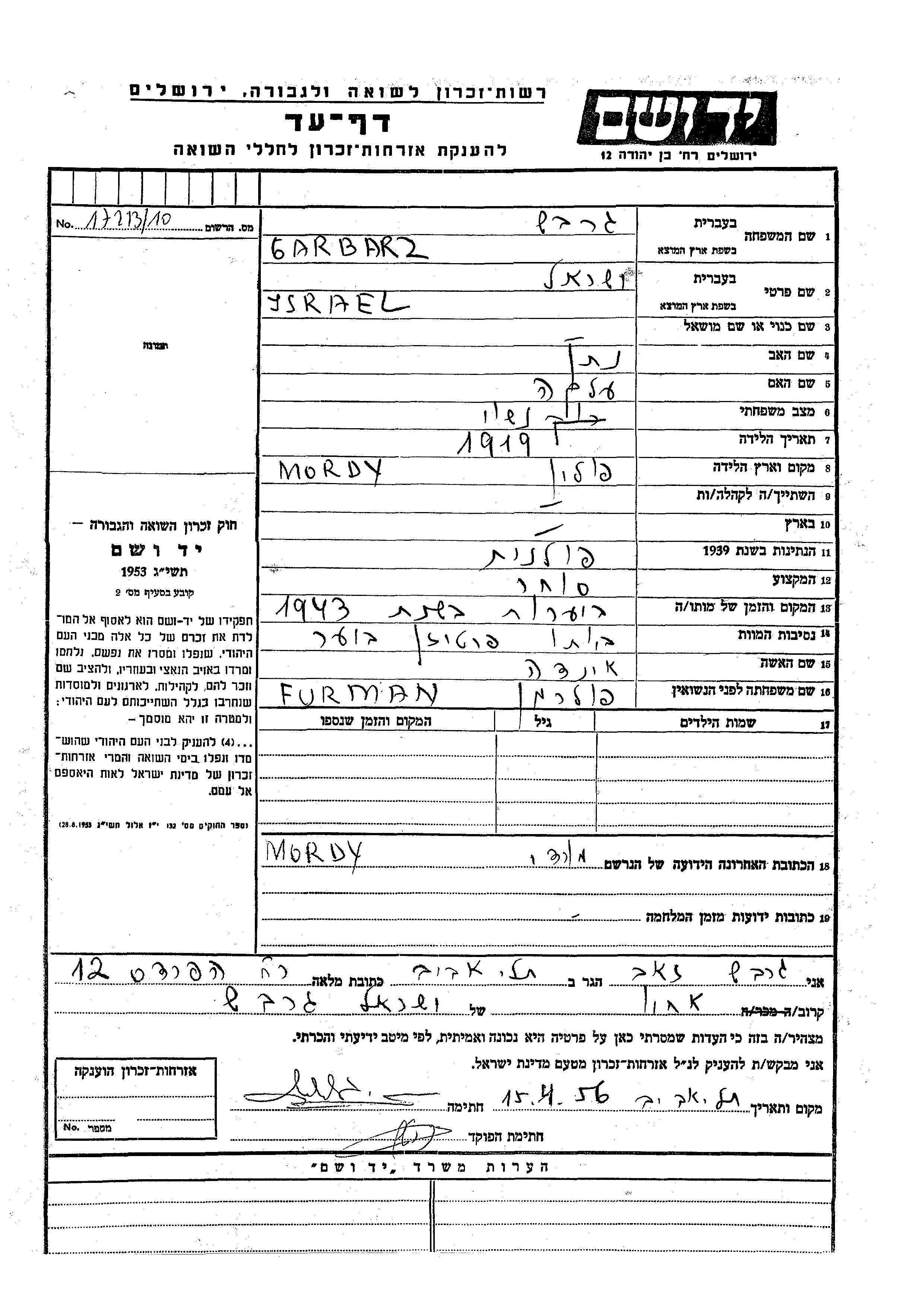 Garbarz Grabash Israel 1919 endroit inconnu, Feuille de témoignage