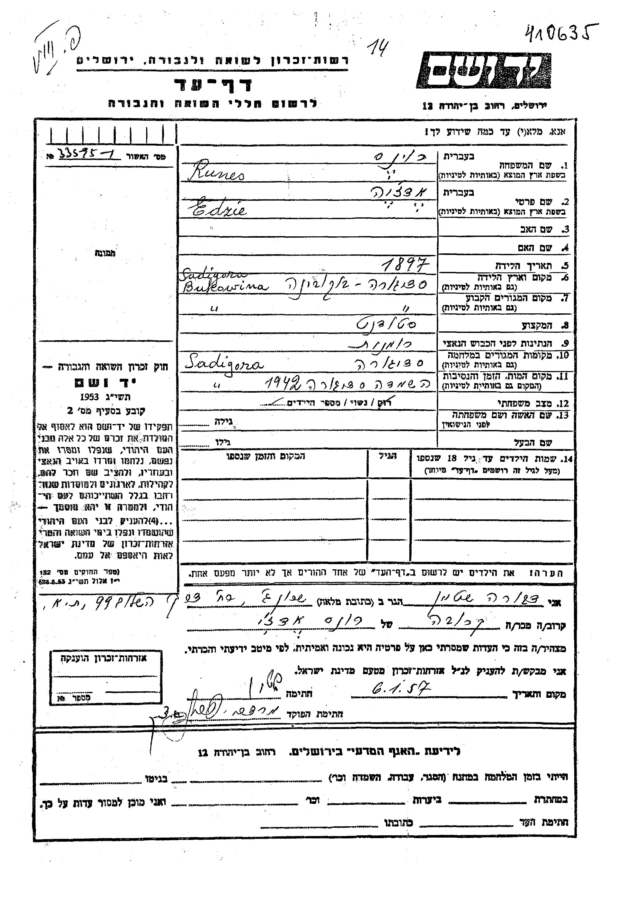 Runes Edzie 1897 Sadigora, Roumanie Feuille de témoignage