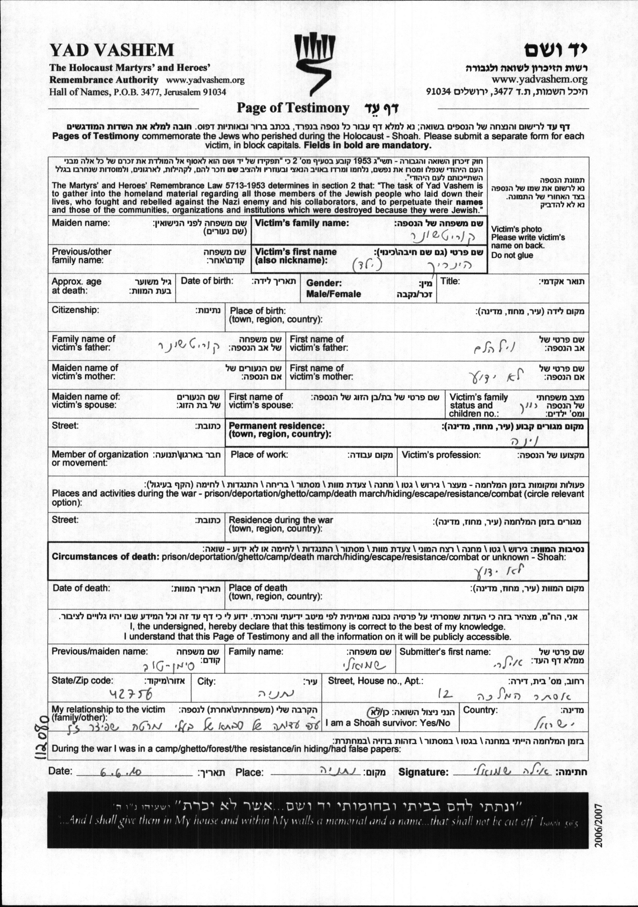 Yad Vashem - Pages of Testimony Names Memorial Collection