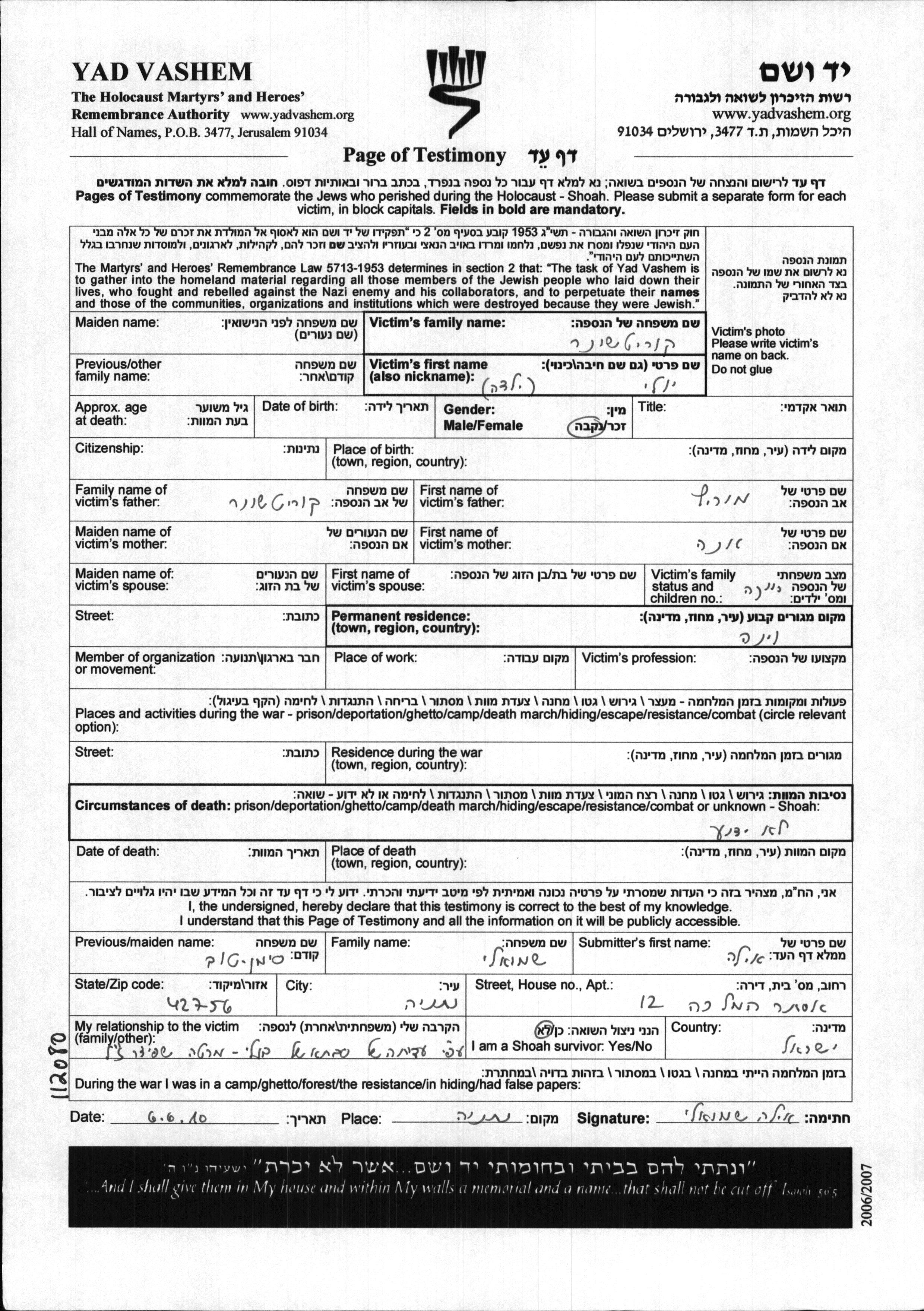 Yad Vashem - Pages of Testimony Names Memorial Collection