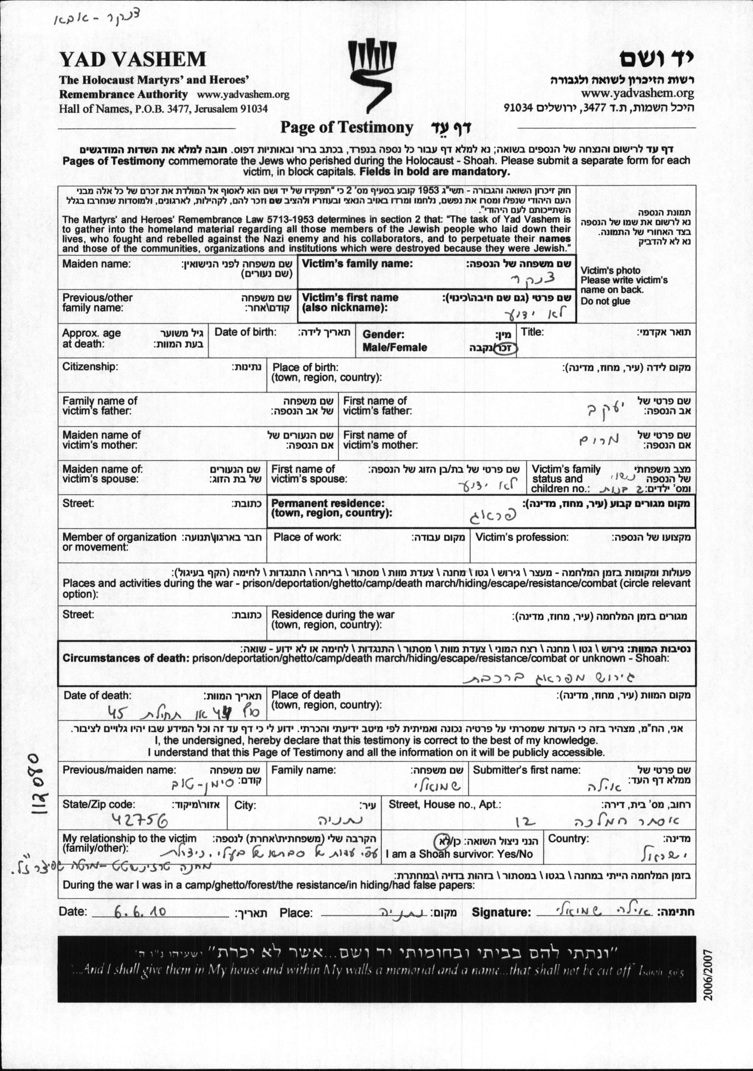 Yad Vashem - Pages of Testimony Names Memorial Collection