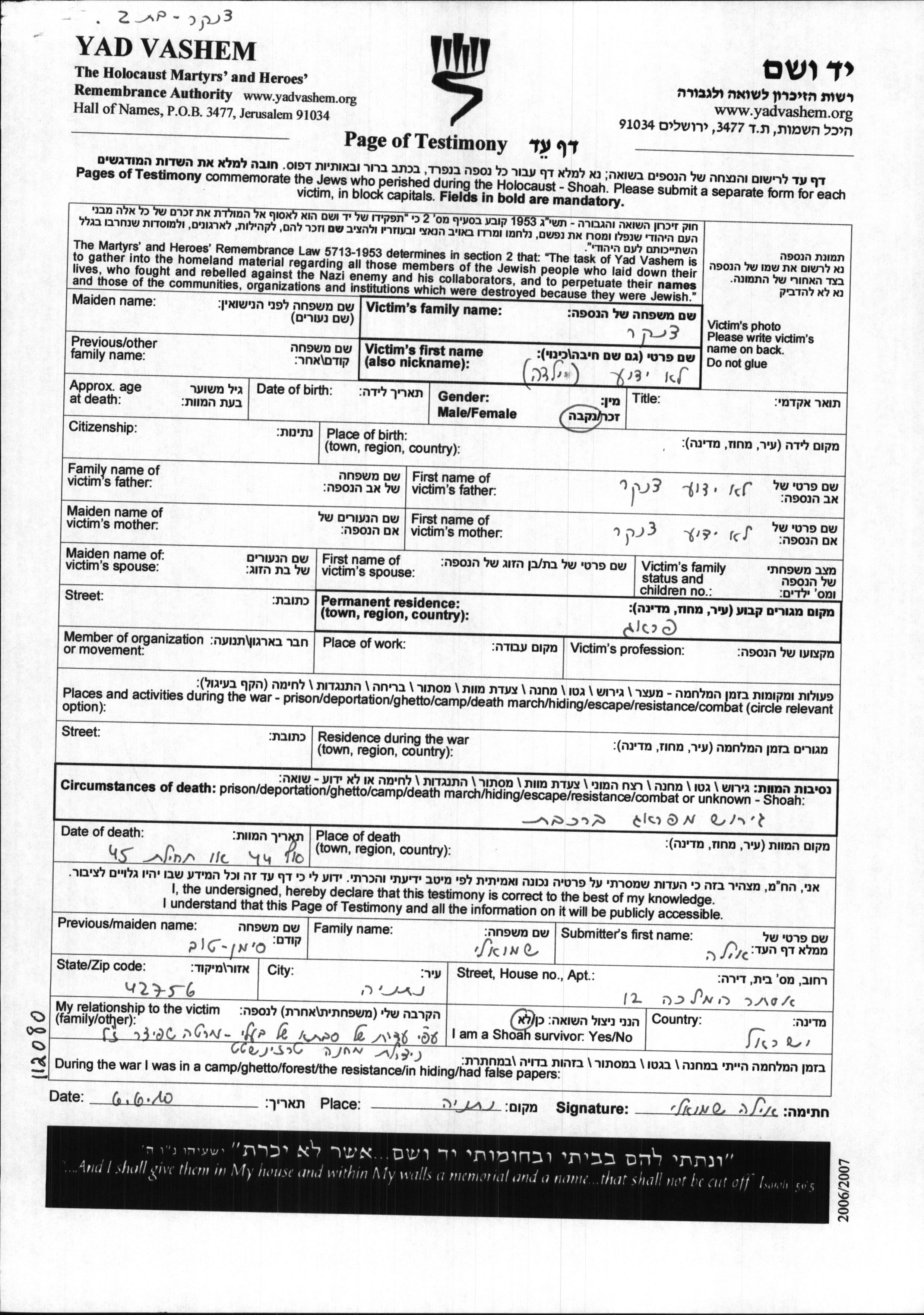 Yad Vashem - Pages of Testimony Names Memorial Collection