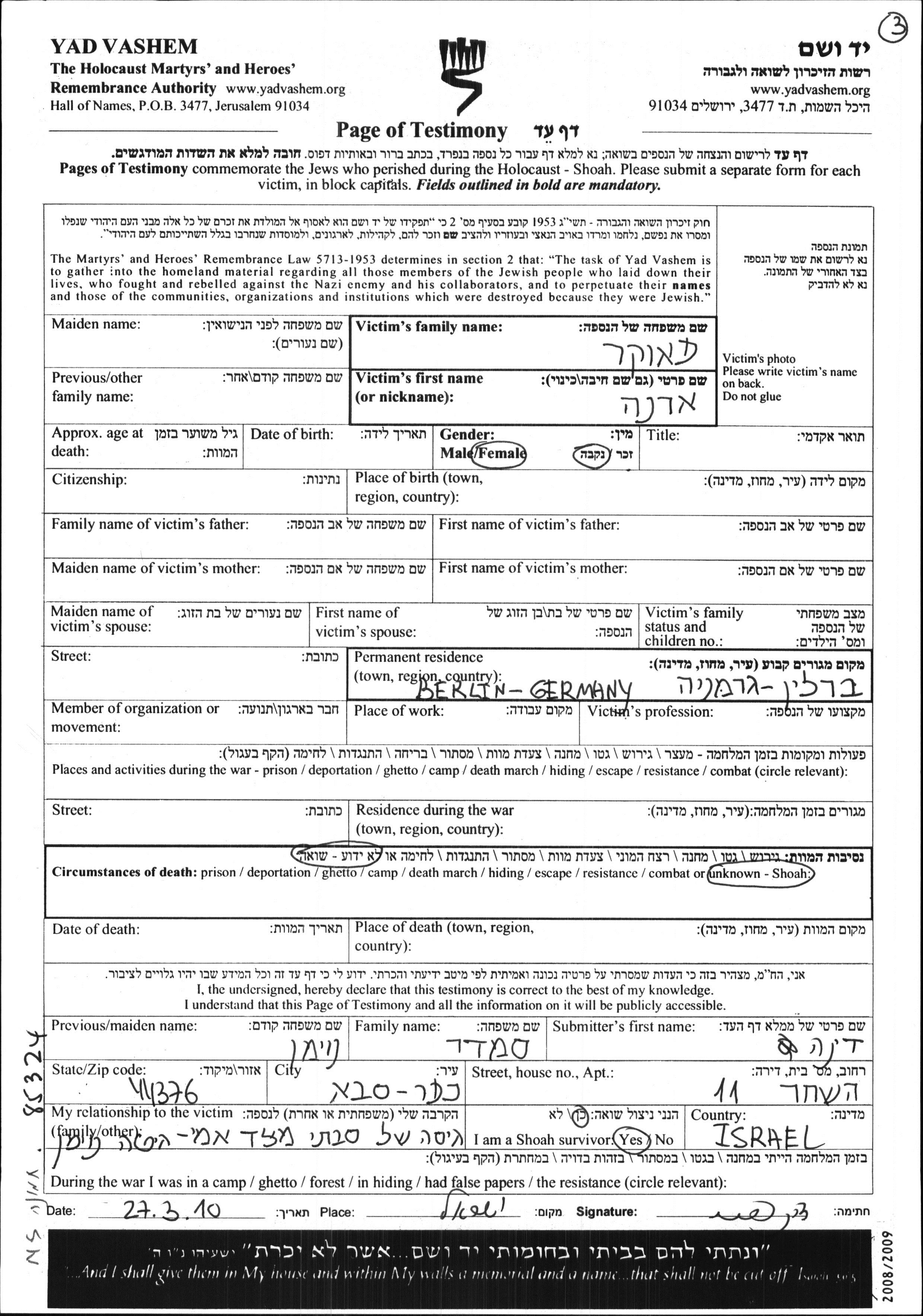 Yad Vashem - Pages of Testimony Names Memorial Collection