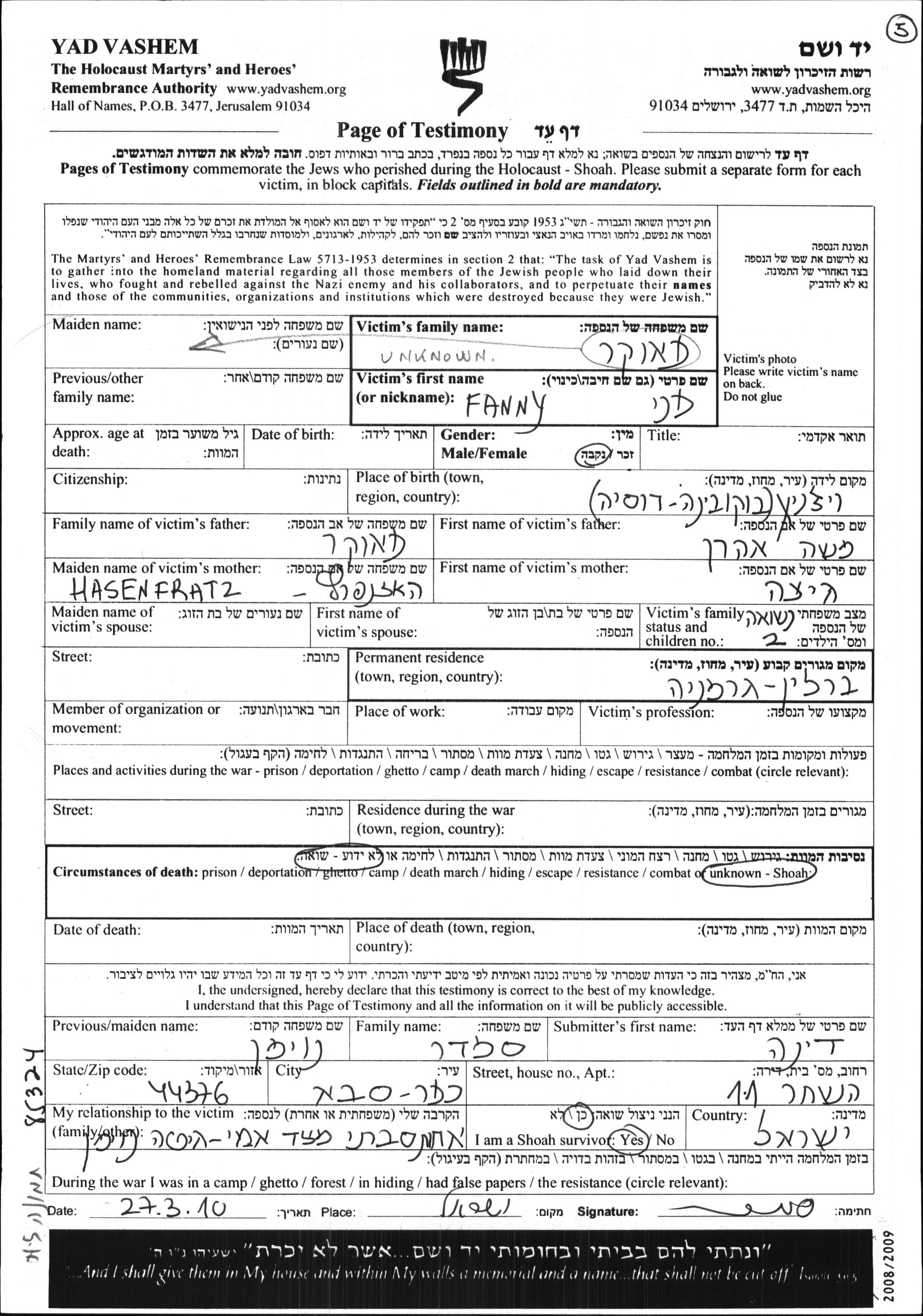 Fanny nom inconnu née Pauker est née à Viznits, Roumanie, fille de Moshe Aharon et de Gitza née Hasenfratz. Elle était Mariée. Avant la seconde guerre mondiale elle vivait à Berlin, Allemagne.