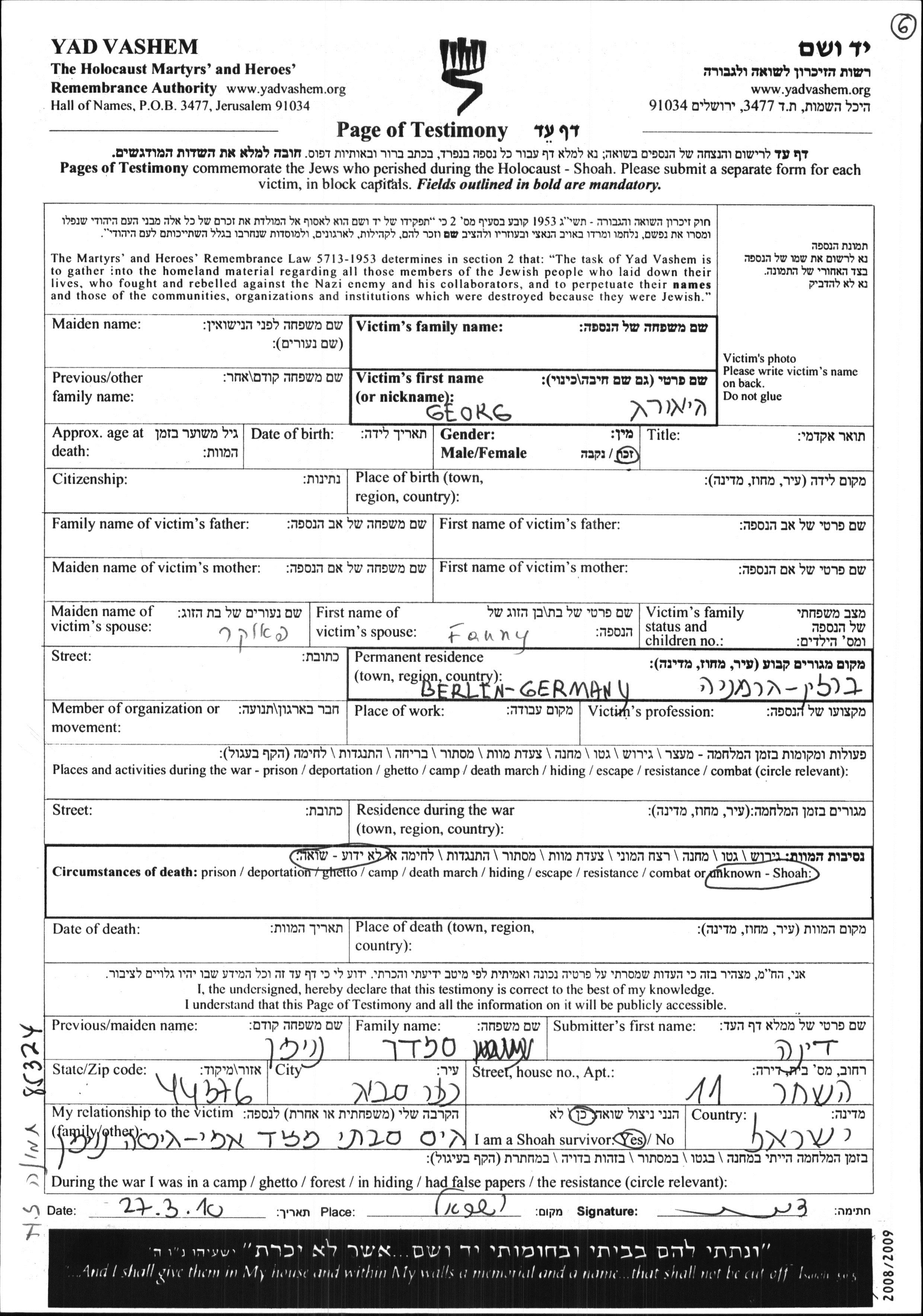 Georg nom inconnu. Il était Mariée à Fanny née Pauker. Avant la seconde guerre mondiale il vivait à Berlin, Allemagne.