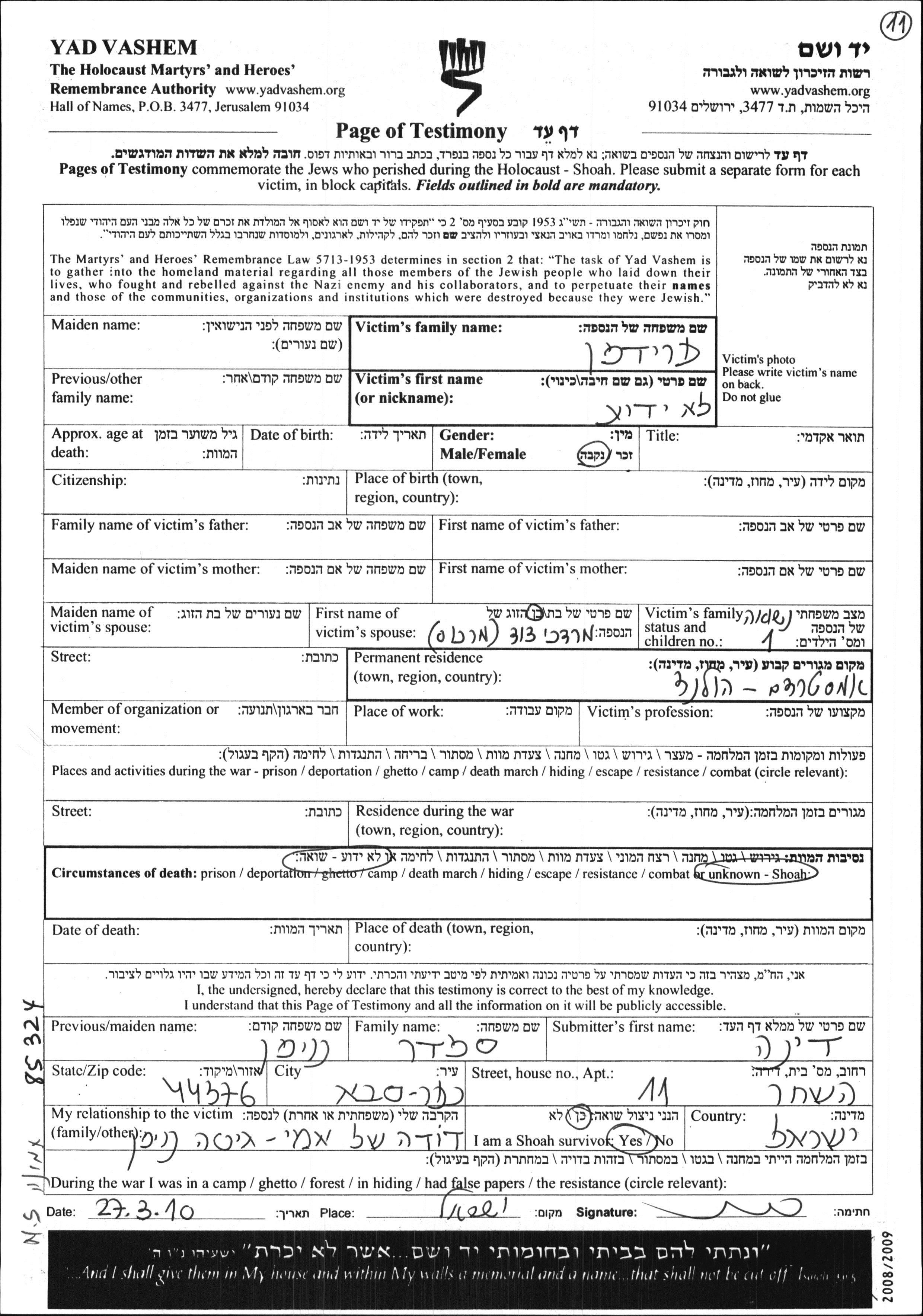 Yad Vashem - Pages of Testimony Names Memorial Collection
