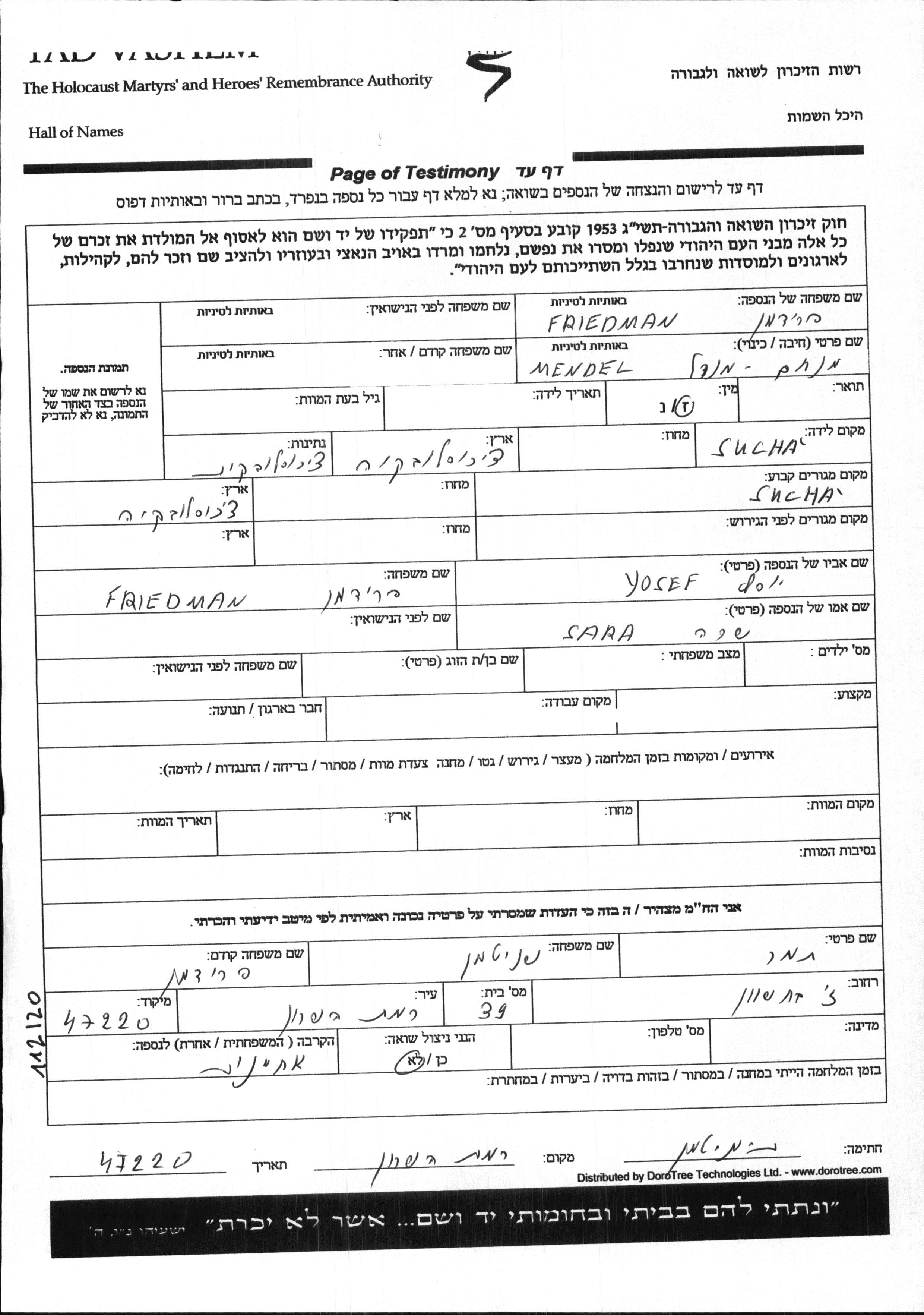 Mendel Menakhem Friedman est né à Sucha, Tchécoslovaquie, fils de Yosef et de Sara. Avant la seconde guerre mondiale il vivait à Sucha, Tchécoslovaquie.