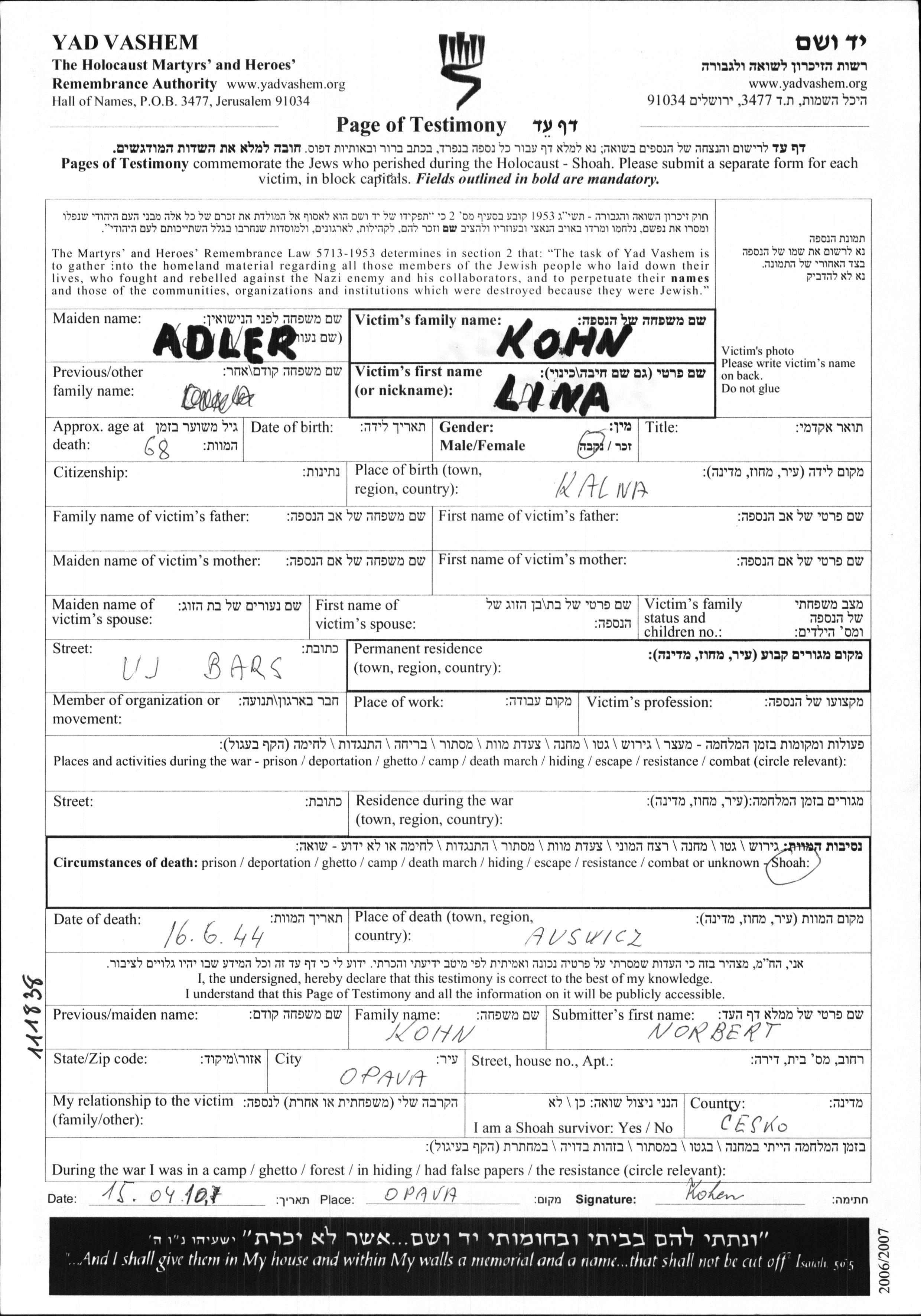 Lina Kohn née Adler est née à Kalna, Tchécoslovaquie. Avant la seconde guerre mondiale elle vivait à Kalna, Tchécoslovaquie. Pendant la guerre, elle était à Kalna, Tchécoslovaquie.