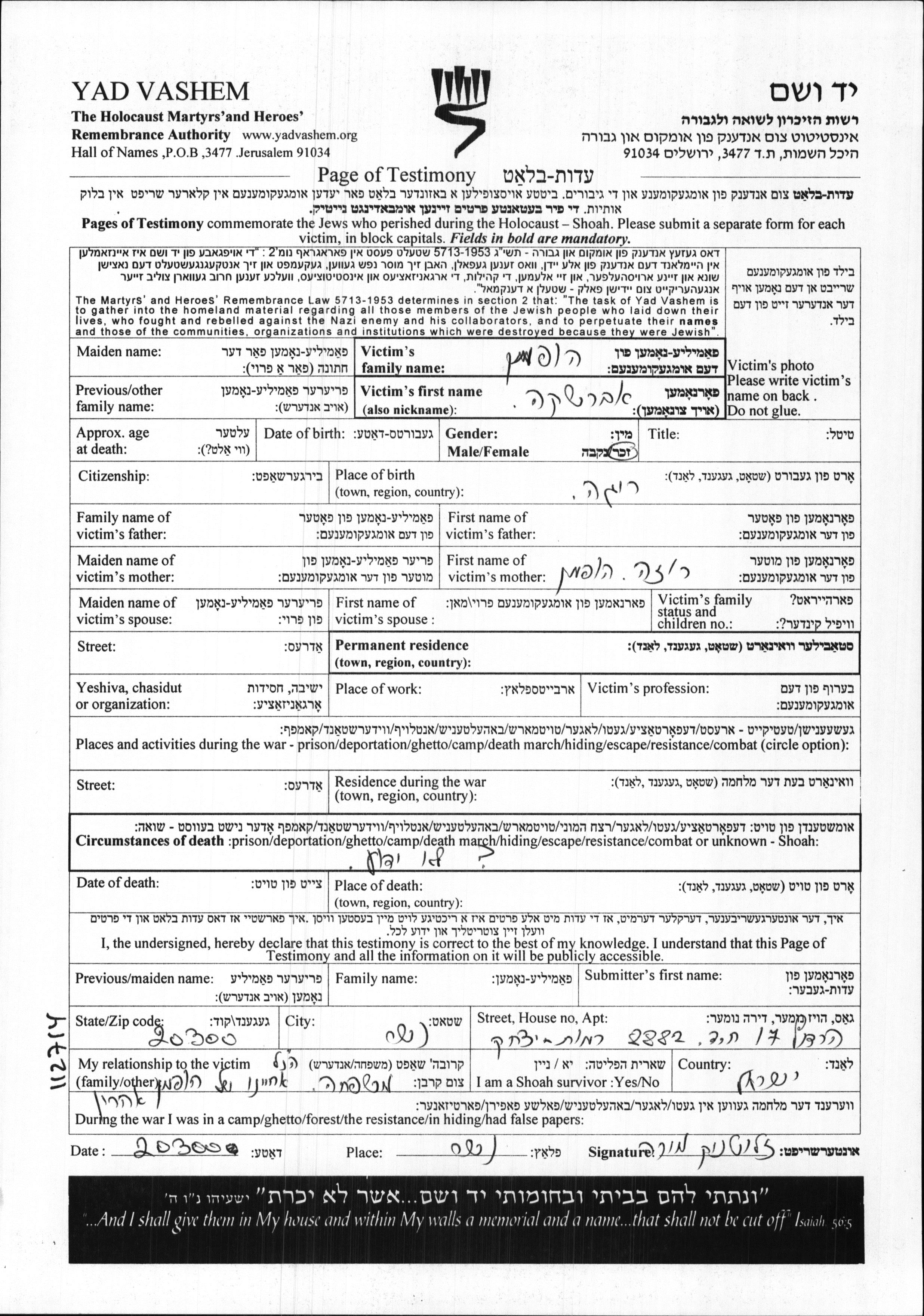 Yad Vashem - Pages of Testimony Names Memorial Collection