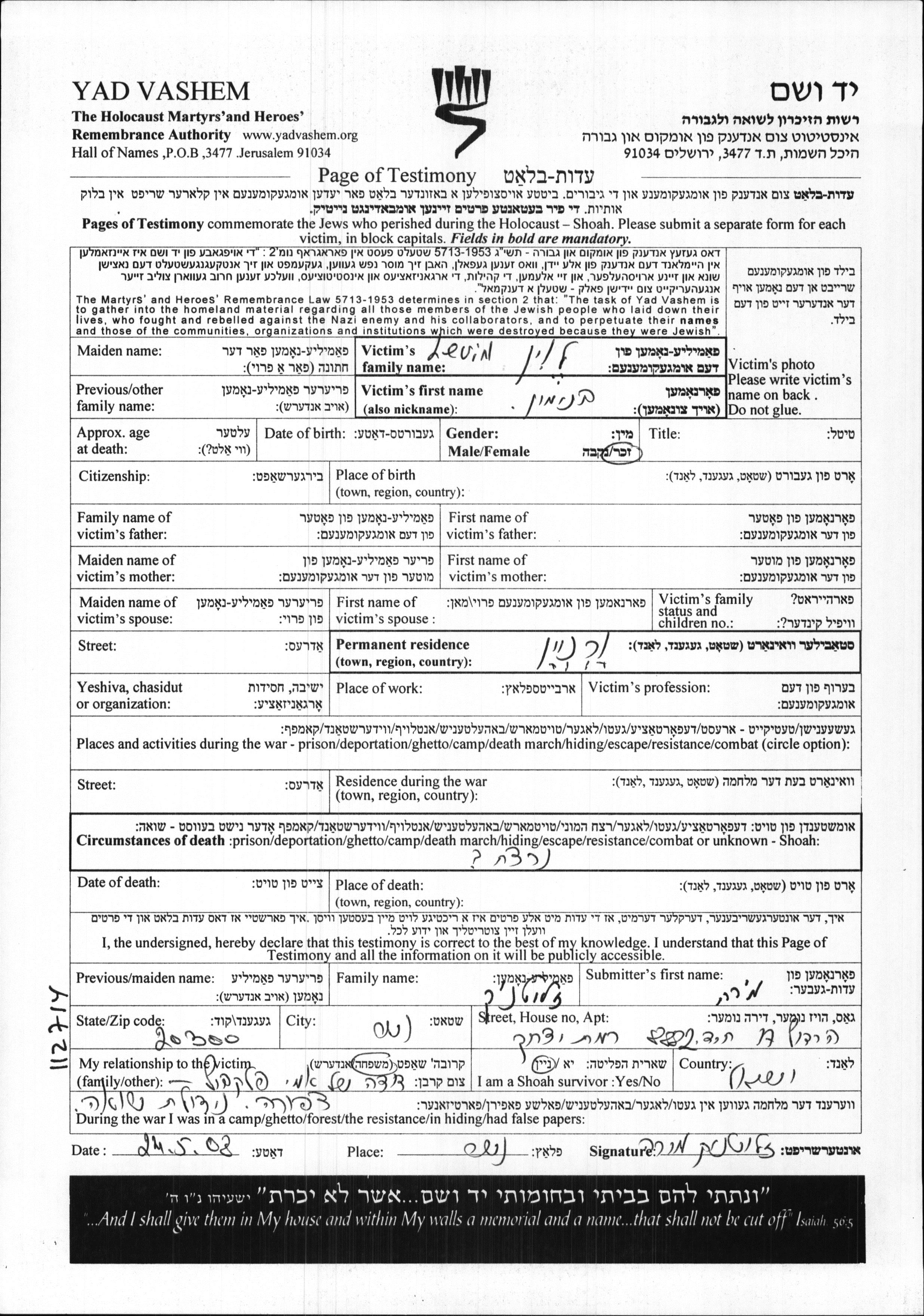 Yad Vashem - Pages of Testimony Names Memorial Collection